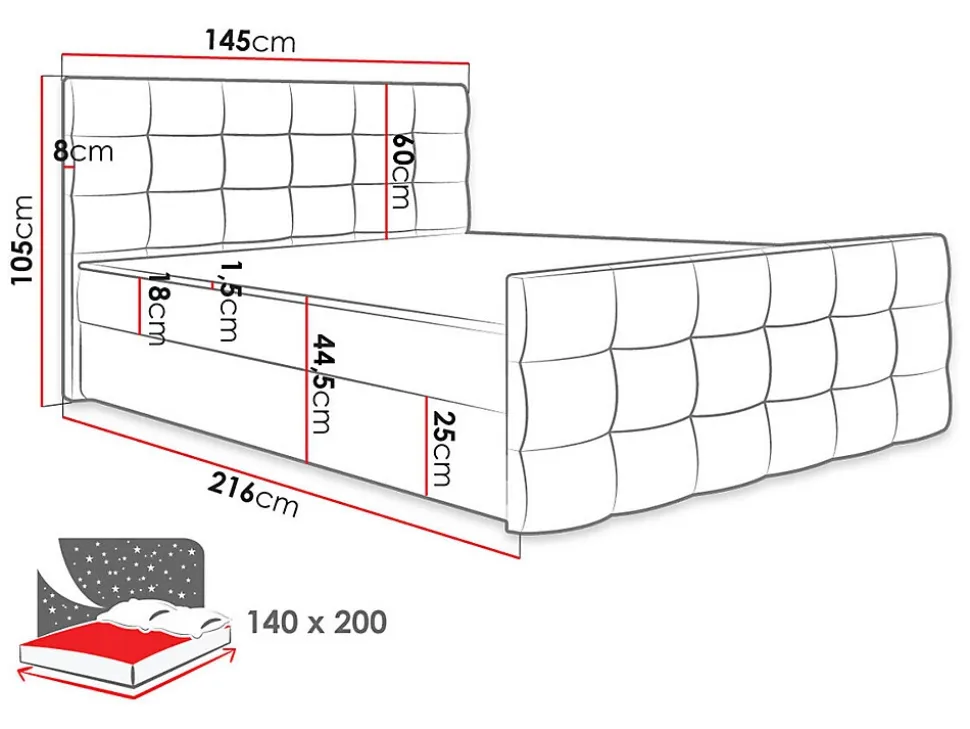 Lit continental Memphis 118 (Rico 20) Caractéristiques: Largeur: 145 cm; Origine: Union européenne; Sommier à lattes: Disponible; Matelas: Disponible; Boîte de literie: Disponible; Taille du matelas: 1400 x 2000 cm; Hauteur: 105 cm; Longueur: 216 cm; Poids: 119 kg; Matériau: Tissu; Pieds: Absent; Type de matelas: Avec ressorts (Bonnell); Fermeté du matelas: Moyen; Hauteur de la zone de couchage: 44.5 cm; Matériau du cadre: Stratifié; Caractéristiques du matelas: Mousse polyuréthane t30; Surmatelas: Disponible; Hauteur du matelas: 18 cm; Épaisseur du surmatelas: 1.5 cm; Caractéristiques du surmatelas: Lavable; Caractéristiques du surmatelas: À deux côtés; Caractéristiques du surmatelas: Antiallergique; Caractéristiques du surmatelas: Antifongique; Caractéristiques du surmatelas: Respirant; Hauteur du cadre: 25 cm; Résistance: 20000 Cycles Martindale; Matériel supplémentaire: Bois; Dimensions de la tête de lit: 105 x 145 x 8cm; Tête de lit: Disponible; Mécanisme de levage: Ressort; Dimensions de la boîte à literie: 25 x 195 x 65cm; Bois: Pin; Code produit: 373593