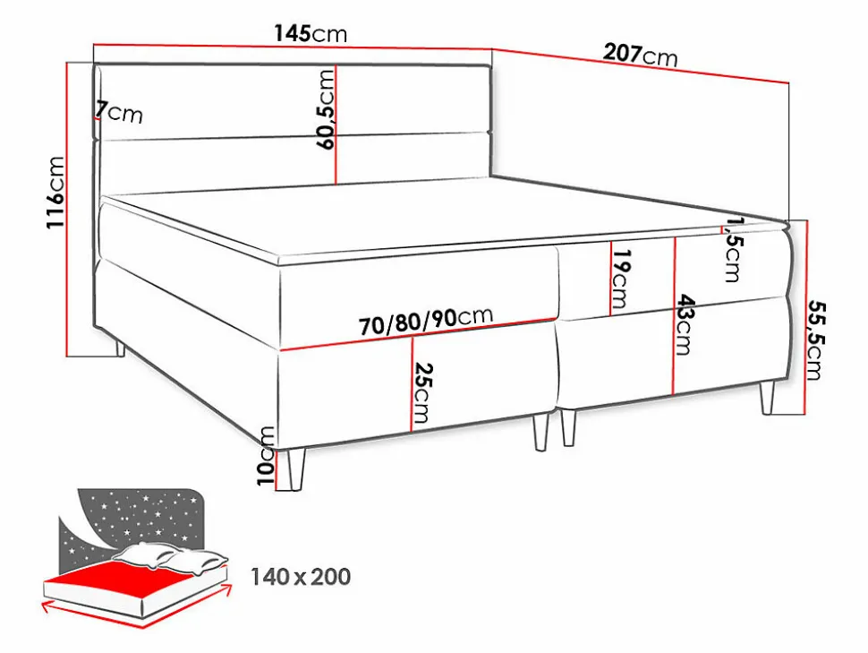 Lit continental Memphis 135 (Itaka 27) Caractéristiques: Largeur: 145 cm; Origine: Union européenne; Sommier à lattes: Disponible; Matelas: Disponible; Boîte de literie: Disponible; Taille du matelas: 1400 x 2000 cm; Hauteur: 116 cm; Longueur: 207 cm; Poids: 111 kg; Capacité de poids maximale: 230 kg; Matériau: Tissu; Pieds: Bois; Type de matelas: Avec ressorts (Bonnell); Fermeté du matelas: Moyen; Hauteur de la zone de couchage: 55.5 cm; Matériau du cadre: Stratifié; Matériau du cadre: Bois; Caractéristiques du matelas: Mousse polyuréthane t30; Surmatelas: Disponible; Hauteur du pied: 10 cm; Hauteur du matelas: 19 cm; Épaisseur du surmatelas: 1.5 cm; Caractéristiques du surmatelas: Housse amovible; Caractéristiques du surmatelas: Lavable; Caractéristiques du surmatelas: À deux côtés; Caractéristiques du surmatelas: Antiallergique; Caractéristiques du surmatelas: Antifongique; Caractéristiques du surmatelas: Respirant; Hauteur du cadre: 25 cm; Résistance: 100000 Cycles Martindale; Type de materiau: Peluche; Dimensions de la tête de lit: 116.4 x 145 x 7cm; Tête de lit: Disponible; Mécanisme de levage: Ressort; Dimensions de la boîte à literie: 25.4 x 196 x 66cm; Bois: Pin; Bois: Épicéa; Code produit: 449684
