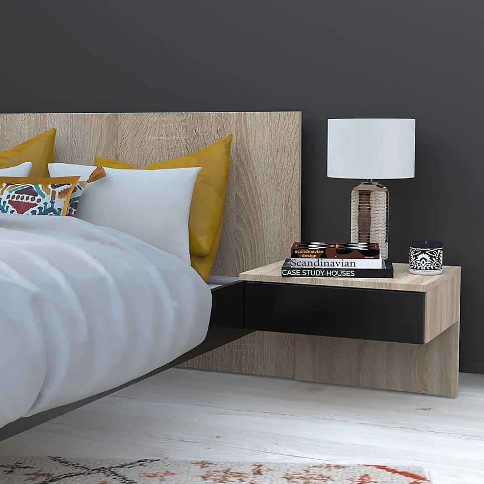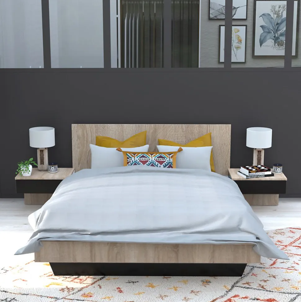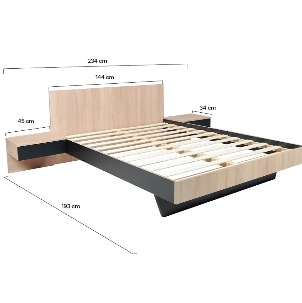 Lit COOL 140×190 cmLe lit COOL allie modernité et praticité avec ses deux chevets suspendus intégrés à la structure de lit. Astucieux, les chevets suspendus ne prennent pas de place au sol et possède chacun un tiroir. Son design bicolore apporte des notes industrielles et une ambiance loft à votre chambre à coucher.Caractéristiques : Structure en panneau de particules.12 lattes multiplis, section 70x8mm.Finition : Noir et décor chêne blanchiDimensions des chevets : 45x36x34 cmDimensions intérieures des tiroirs : 36x28x9 cmLivré démonté avec un sommier et sans matelas. A monter soi-mêmeDimensions:192x234x75 cm