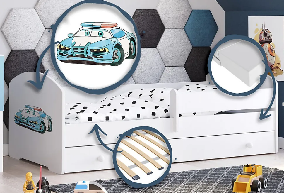 Le modèle LUK combine une construction solide, sécurité et confort. La barrière de protection mobile rend le lit adapté aussi bien aux jeunes enfants qui ont besoin d’une sécurité supplémentaire qu’aux plus grands qui peuvent l’utiliser selon leurs besoins. Le matelas confortable, inclus dans l’ensemble, a été conçu pour garantir un sommeil sain et paisible à l’enfant, tandis que le tiroir spacieux permet un rangement pratique de la literie, des jouets ou des vêtements, aidant à maintenir l’ordre dans la chambre. De plus, les bords arrondis et les bords protégés par du PVC minimisent le risque de blessures, assurant un niveau de sécurité optimal. Le lit est fabriqué à partir de matériaux certifiés et durables, garantissant non seulement sa longévité, mais aussi son sûr et de la santé de l’enfant. Grâce à son impression unique, le meuble devient le point central de la chambre, alliant fonctions pratiques et qualités décoratives.