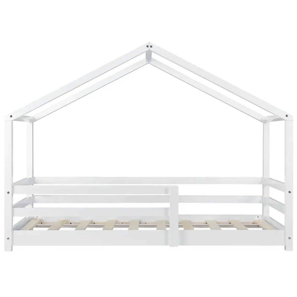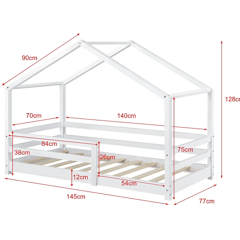 Lit d’enfant en forme maisonCe lit solide en pin est conçu aux enfants. Gâce au design maison, il peut être l’ornement de n’importe quelle chambre d’enfant. Pour assurer la sécurité de votre enfant, le matelas est encadré par des barreaux de protection.Description :- lit d’enfant – design maison – construction solide – montage facile – avec des grilles de protectionDimensions :- dimension entière (Longueur x Largeur x Hauteur) : 145 x 77 x 128 cm – dimension du matelas (Longueur x Largeur) : 140 x 70 cm – entrée de lit (Longueur x Hauteur) : 54 x 12 cm – barreaux de protection (Longueur x Hauteur) : 84 x 26 cm – distance entre le sol et la barre latérale du toit : 75 cm – barre supérieur du côté du lit : 90 cm – distance entre le sol el le dessus de la grille de protection : 38 cmMatière :pinCouleur :blanc, mat laquéContenu de la livraison :1 x lit d’enfant 1 x sommier à lattes Produit de la marque [en.casa]®