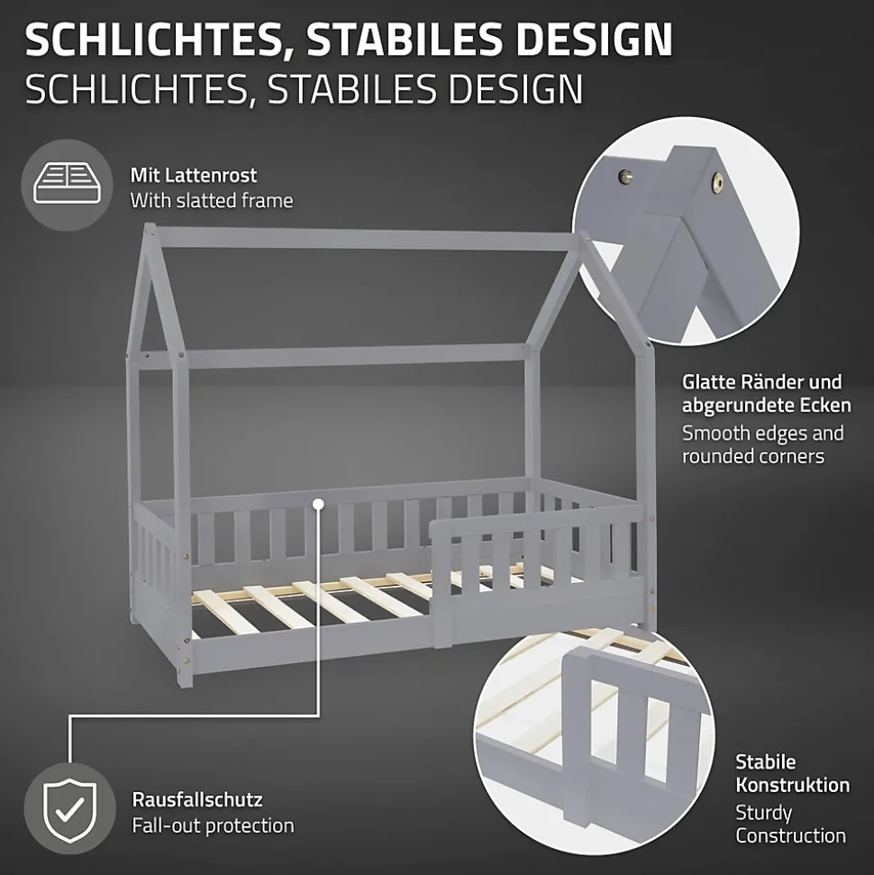 Description du produit :Le lit d’enfant moderne avec toit de ML-Design convient parfaitement comme lieu de retraite pour tes enfants. Il dispose d’une protection antichute sûre, de sorte que toi aussi, tu peux dormir en toute tranquillité la nuit.Le solide sommier à lattes peut supporter jusqu’à 120 kg. Plus d’un enfant peut donc dormir ou jouer ici.Grâce au cadre en bois stable du lit, tu peux ajouter de superbes décorations sur le toit. Tu peux par exemple y installer des guirlandes lumineuses LED, des moustiquaires, de simples rideaux ou des carillons. Ainsi, le simple cadre de lit en bois se transforme en un superbe lieu de retraite pour ton enfant.En quelques gestes, tu as monté le lit d’enfant et il est prêt à faire plaisir à ton enfant.Caractéristiques du produit :Extrêmement robusteFacile à monterPeut supporter jusqu’à 120 kgEn bois de pin naturelNombreuses possibilités d’aménagementLivraison :1 x lit d’enfant1 x sommier à lattes1 x toit1 x instructions