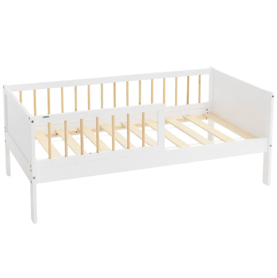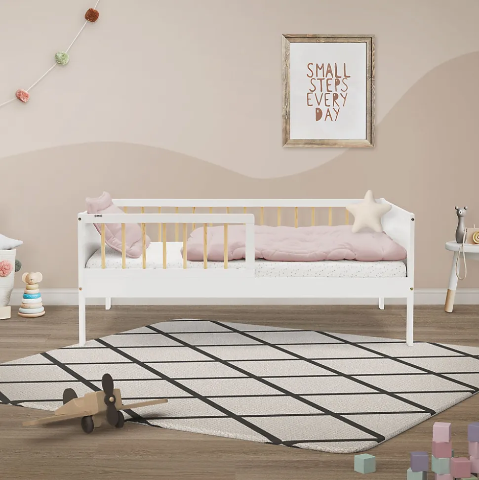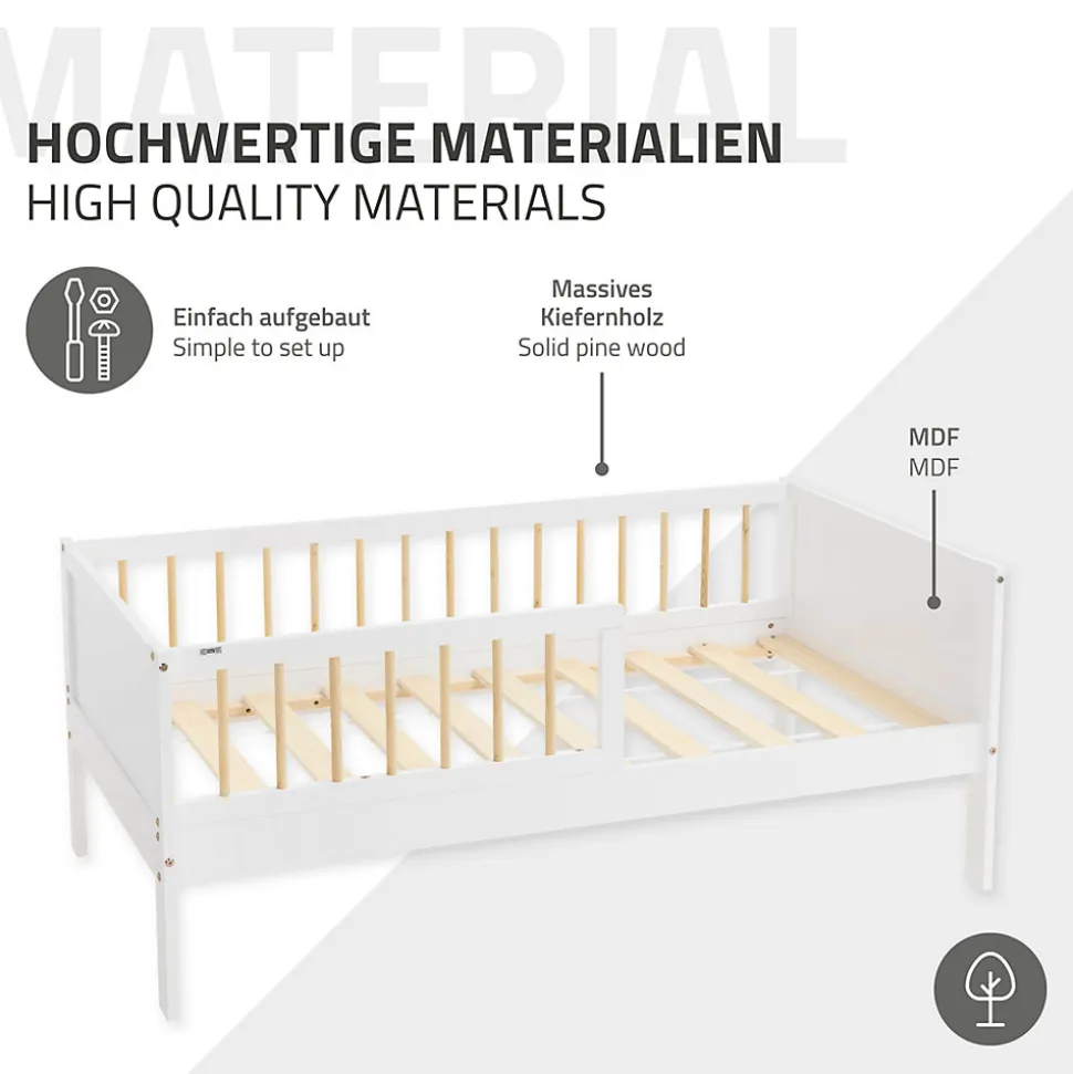 Ton nouveau lit d’enfant – sûr, stable et confortableAménage la chambre à coucher de ton enfant avec ce lit d’enfant en pin de qualité supérieure. Avec ses dimensions de 70 x 140 cm, il est parfait pour la transition du lit de bébé vers un lit plus grand. Le cadre robuste en pin assure la stabilité et un aspect naturel qui convient à chaque chambre d’enfant. Grâce à la protection antichute intégrée, ton enfant dort en toute sécurité, même s’il bouge beaucoup la nuit. Note que le matelas n’est pas compris dans la livraison, tu peux donc choisir le matelas parfait pour les besoins de ton enfant.Les avantages en un coup d’œil :Cadre stable en bois de pin : durable et robuste pour une longue durée de vie.Protection antichute intégrée : assure un sommeil sûr, même en cas de nuits agitées.Idéal pour les enfants : Dimensions de 70 x 140 cm, parfaites pour la phase de transition.Capacité de charge jusqu’à 70 kilogrammes : convient aussi parfaitement aux enfants plus grands.Adaptable individuellement : livré sans matelas, tu peux ainsi choisir le matelas idéal.Avec sommier à lattes : sommier à lattes déjà intégré.Contenu de la livraison :1 x lit d’enfant sans matelasMatériel de montage