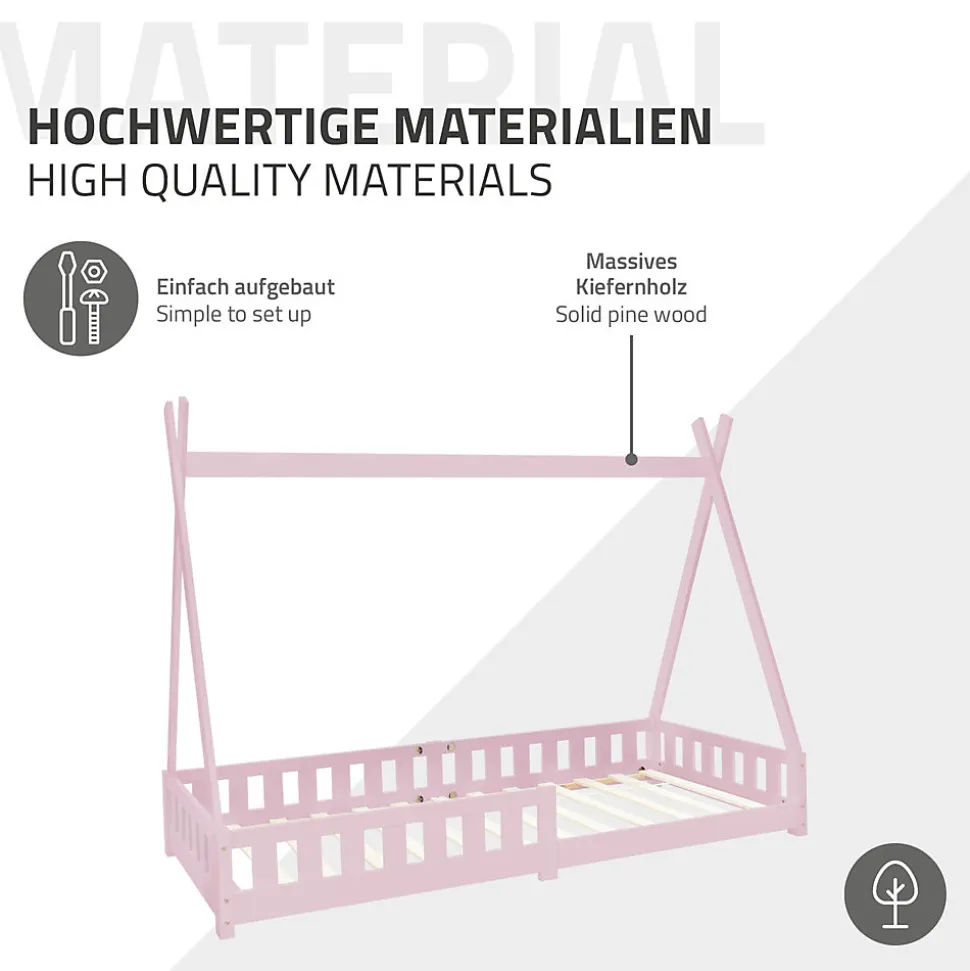 Description du produit :Une tente tipi comme cadre de lit est le rêve de chaque enfant : Avec ce lit d’enfant, tu peux faire plaisir à ta progéniture. Grâce à la structure en bois de pin, tu peux tendre de beaux draps sur la structure ou y fixer des guirlandes lumineuses confortables et ainsi personnaliser le lit. D’un lieu de sommeil à une oasis de bien-être ! Grâce à la protection antichute, ton enfant est encore plus en sécurité. De plus, le sommier à lattes est inclus. Sur la grande surface de couchage, ton enfant a suffisamment de place pour se détendre ou pour jouer.Caractéristiques du lit :En bois de pinSommier à lattes inclusParfait pour la décorationPlus qu’un simple espace de couchageSécurité accrue grâce à la protection antichuteContenu de la livraison :1 x lit d’enfantInstructions