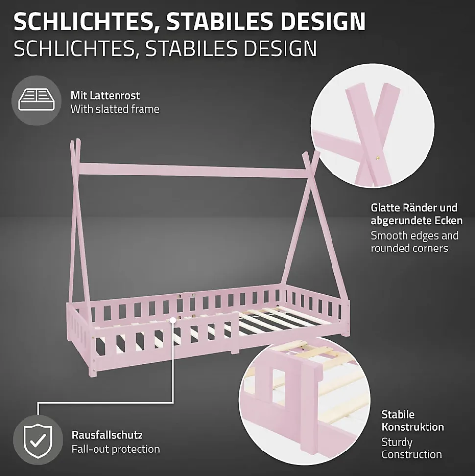 Description du produit :Une tente tipi comme cadre de lit est le rêve de chaque enfant : Avec ce lit d’enfant, tu peux faire plaisir à ta progéniture. Grâce à la structure en bois de pin, tu peux tendre de beaux draps sur la structure ou y fixer des guirlandes lumineuses confortables et ainsi personnaliser le lit. D’un lieu de sommeil à une oasis de bien-être ! Grâce à la protection antichute, ton enfant est encore plus en sécurité. De plus, le sommier à lattes est inclus. Sur la grande surface de couchage, ton enfant a suffisamment de place pour se détendre ou pour jouer.Caractéristiques du lit :En bois de pinSommier à lattes inclusParfait pour la décorationPlus qu’un simple espace de couchageSécurité accrue grâce à la protection antichuteContenu de la livraison :1 x lit d’enfantInstructions