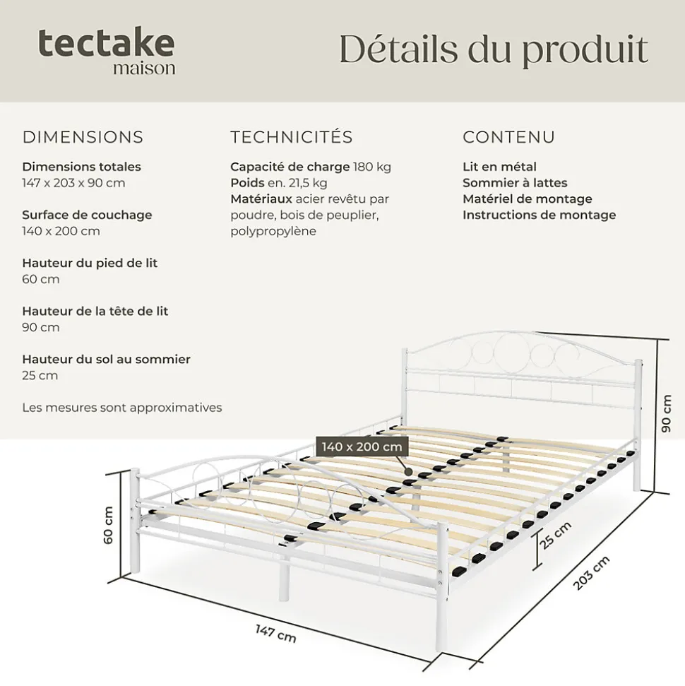 - Caractéristiques techniques:Dimensions totales du cadre de lit (LxlxH) : environ 203 cm x 147 cm x 90 cm.Dimensions de la surface couchage (Lxl) : environ 200 cm x 140 cm.Hauteur Pieds de lit : environ 60 cm. Hauteur Tête de lit : environ 90 cm. Hauteur du plancher au sommier à lattes : 25 cm. Poids : environ 21,5 kg. Matériau : Cadre en acier peint par poudrage, Pieds en plastique, Bois de peuplier.