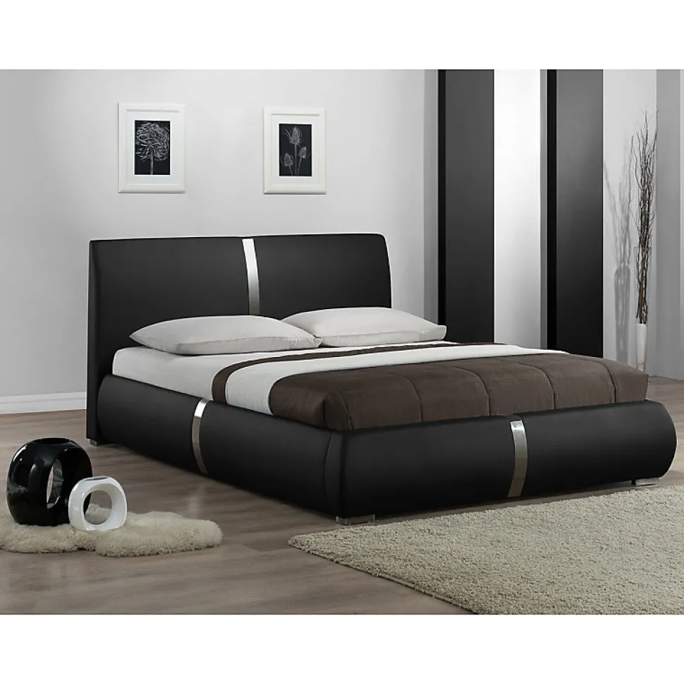 Découvrez le lit en simili noir 140 x 190 cm EDEN. Ce lit apportera dans votre chambre une touche élégante et raffinée ! Ses bandes décoratives en métal chromé son élégamment mise en avant par son revêtement en simili noir. Toutes ses finitions soignées lui donnent un aspect confortable et généreux. Existe également en 160 x 200 cm. Caractéristiques : PRODUIT : Lit en simili noir 140 x 190 cm EDEN. COULEUR : Noir. COMPOSITION : Structure en pin massif et panneaux de particules moyenne densité. Piètement et bande décoratives en métal. Revêtement simili noir 65% PU, 21% Polyester et 14% Coton. Garnissage en mousse polyuréthane 21kg/m³. Tête de lit confortable et rembourré avec finitions soignées 350gr/m². Sommier 26 lattes, 13 lattes en bois de hêtre de chaque côté, longueur : 70 cm x hauteur : 1 cm x profondeur : 6 cm, écart entre les lattes : 7 cm. DETAILS : Matelas et linges NON INCLUS. 3 pieds de soutien INCLUS pour plus de solidité. DIMENSIONS GENERALES APPROXIMATIVES : Longueur 215 cm x Hauteur 94 cm x Profondeur 151 cm. ATTENTION : La couleur de l’article peut légèrement varier par rapport au produit présenté sur la photo. ENTRETIEN : Ne pas utiliser de produits ou accessoires abrasifs. Nettoyage professionnel conseillé. LIVRAISON : Uniquement devant votre maison ou au pied de votre immeuble. Pas de livraison en étage ou d’installation. SMS DE PRISE DE RENDEZ-VOUS (1 jour plein du lundi au vendredi) ou récupération de l’article dans l’agence de livraison près de chez vous. NOMBRES DE COLIS : 3. POIDS COLIS : 47 kg. A monter soi-même.