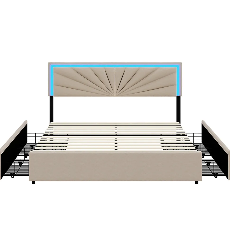 Description du produitUne tête de lit avec éclairage LED crée une atmosphère chaleureuse dans votre chambre et offre un endroit confortable pour s’appuyer pour lire et se détendre avant de se coucher. La structure solide du sommier à lattes prolonge la durée de vie de votre matelas en latex, en mousse à mémoire de forme ou à ressorts sans avoir besoin d’un lit à sommier tapissier. Sous le lit se trouvent 4 grands tiroirs push-pull qui couvrent vos besoins de rangement quotidiens et vous aident à garder la pièce bien rangée et propre. Le lit double fortuna Lai augmente votre bien-être. Détails du produit : – Matériau : lin. – Dimensions (l x p x h) : 208 x 149 x 106,5 cm. – Poids : 40 kg. – Charge maximale : 250 kg. Surface de couchage de 140 x 200 cm (sans matelas). – Nombre de lamelles : 12. Contenu de l’emballage : 1 lit. 1 mode d’emploi (français non garanti). Remarques : – Et l’ensemble du produit est livré en 2 paquets et peut arriver à des jours différents. Veuillez être patient pour la livraison complète. Les coussins, les couvertures et les objets de décoration représentés sur la photo ne sont pas inclus