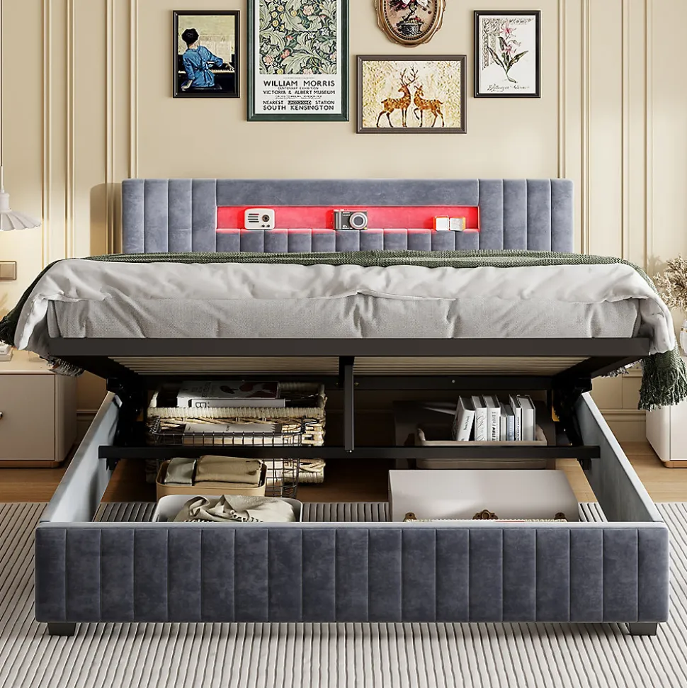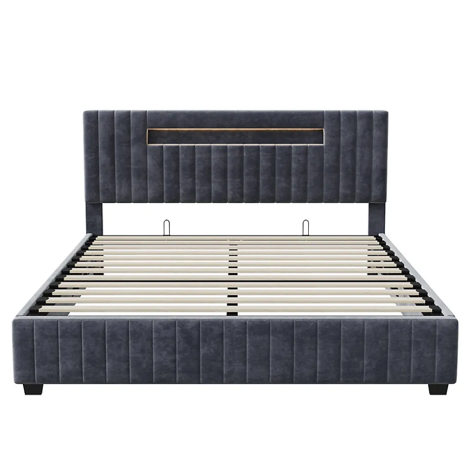 Livraison en Plusieurs Colis : En raison des grandes dimensions du lit, celui-ci sera livré en 2 colis séparés. Ne vous inquiétez pas si tous les colis n’arrivent pas en même temps.Système de levage hydraulique facile à utiliser : Grâce au mécanisme hydraulique intégré, le lit se soulève en douceur et sans effort, vous offrant un accès facile à l’espace de rangement sous le lit.Éclairage LED intégré au design moderne : La tête de lit est équipée d’une bande LED qui illumine votre chambre avec différentes couleurs, contrôlables via une application ou une télécommande.Matériaux de qualité en velours gris doux : Ce lit double est fabriqué en velours gris doux au toucher, ajoutant une touche de luxe et de confort à votre chambre à coucher.Grand espace de rangement caché : Profitez d’un lit pratique avec un coffre de rangement spacieux sous le sommier. Parfait pour stocker vos draps, couvertures ou tout autre objet encombrant.Couleur:BeigeDimensions du produit (L x l x h):205 x 141 x 112 cm; 49 kilogrammesCapacité de poids maximum:300 KilogrammesCaractéristiques:Tête de litPoids de l’article:49 Kilograms