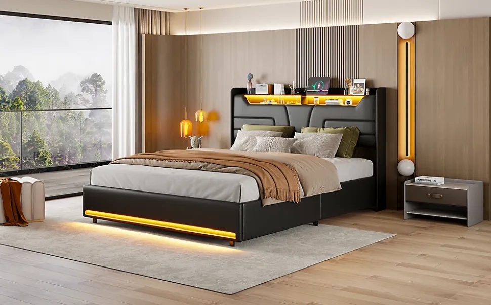 Lit rembourré noir en similicuir PU, design luxueux avec rangement, LED et station de charge.Caractéristiques :Matériaux premium : similicuir PU doux et élégant, finition haut de gamme.Rangement flexible : compartiments dans la tête de lit + grand coffre sous sommier, ouverture facile avec vérin.Éclairage LED intégré : réglable en couleur et luminosité via télécommande.Station de charge : prises + ports USB/Type-C intégrés dans la tête de lit.Sommier robuste : lattes en bois massif + métal, confort et durabilité.Livraison en 2 colis (peuvent arriver séparément).Détails produit :Matériaux : métal + PU + boisDimensions : 143,6 × 211 × 109 cmPoids : 58 kgCharge max : 300 kgSurface couchage : 140 × 200 cm (sans matelas)Couleur : noirMontage complet requis (outils inclus)