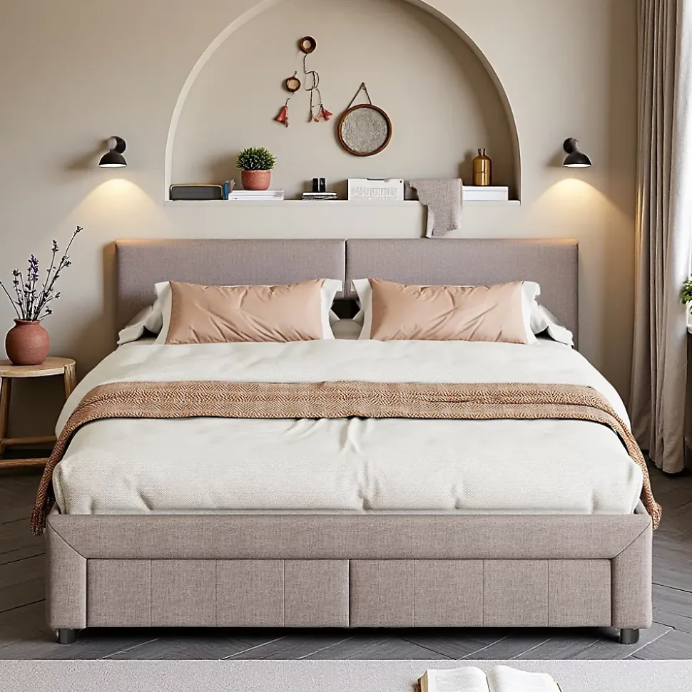 Design moderne et pratique : Lit 140×200 cm en tissu gris élégant, adapté à tous les styles de chambre, alliant esthétique et fonctionnalité. 2 tiroirs spacieux au pied du lit : Deux grands tiroirs intégrés offrent un espace de rangement supplémentaire pour vos vêtements, draps, couvertures ou objets personnels, faciles à ouvrir et à fermer. Tête de lit multifonctionnelle : La tête de lit est équipée de poches latérales pratiques (« oreilles ») pour ranger télécommandes, téléphones ou livres, ainsi que de compartiments intégrés pour vos objets du quotidien. Éclairage LED d’ambiance intégré : Lumière LED douce et moderne, idéale pour lire, se détendre ou créer une atmosphère chaleureuse et intime dans votre chambre. Matériaux de qualité et confort durable : Revêtement en tissu gris respirant et résistant, structure solide pour une stabilité optimale, dimensions 140×200 cm parfaites pour un sommeil confortable et réparateur. Détails : Dimensions : 216x145x114cm, Matelas adapté : 140×200 cm (matelas non inclus), Remarque : Ce lit sera expédié en deux lots. Pour des raisons logistiques, il se peut qu’ils n’arrivent pas en même temps. Veuillez patienter.