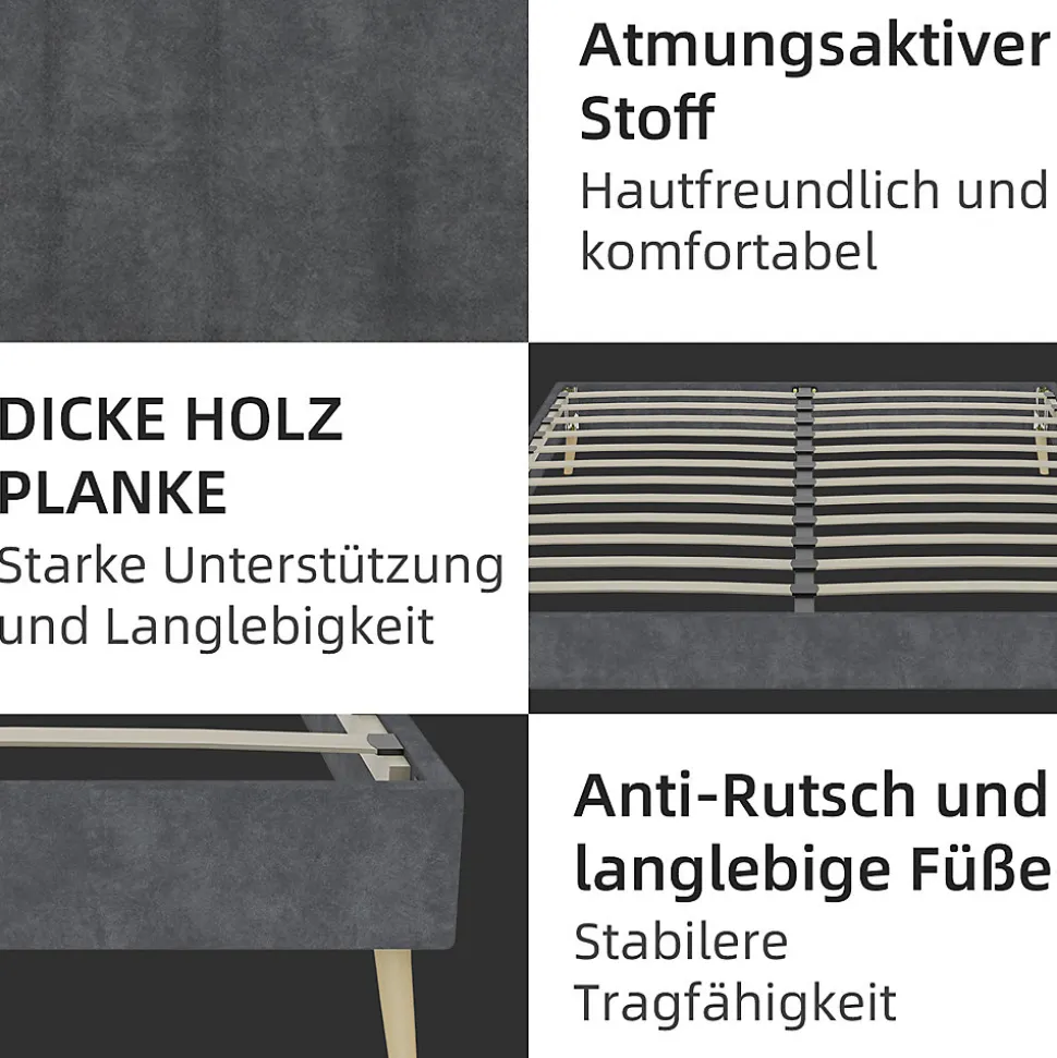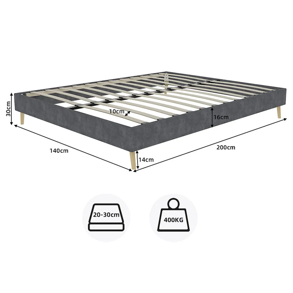 ▶ ▶ Détails ▶────────────────● Type de produit : Lit double● Couleur : Gris● Matériau : Tissu + Métal● Matière de rembourrage : Mousse à mémoire de forme● Scénario : Chambre à coucher● Nom du produit : Cadre de lit (sans vérin à gaz, sans tête de lit et sans matelas)● Dimensions du lit : 140 x 200 cm● Matériau du cadre de lit : Composite● Poids du produit : 17 kg● Poids total : 19 kg● Montage : Requis● Nombre de colis : 1► Remarques ►※ Ce cadre de lit est fabriqué en panneaux de particules robustes et en bois de caoutchouc, il ne nécessite pas de matelas boxspring, ce qui le rend stable et durable.※ Le montage du cadre de lit est simple et rapide grâce aux instructions claires incluses.※ Toutes les images de produits ont été prises avec des produits réels.