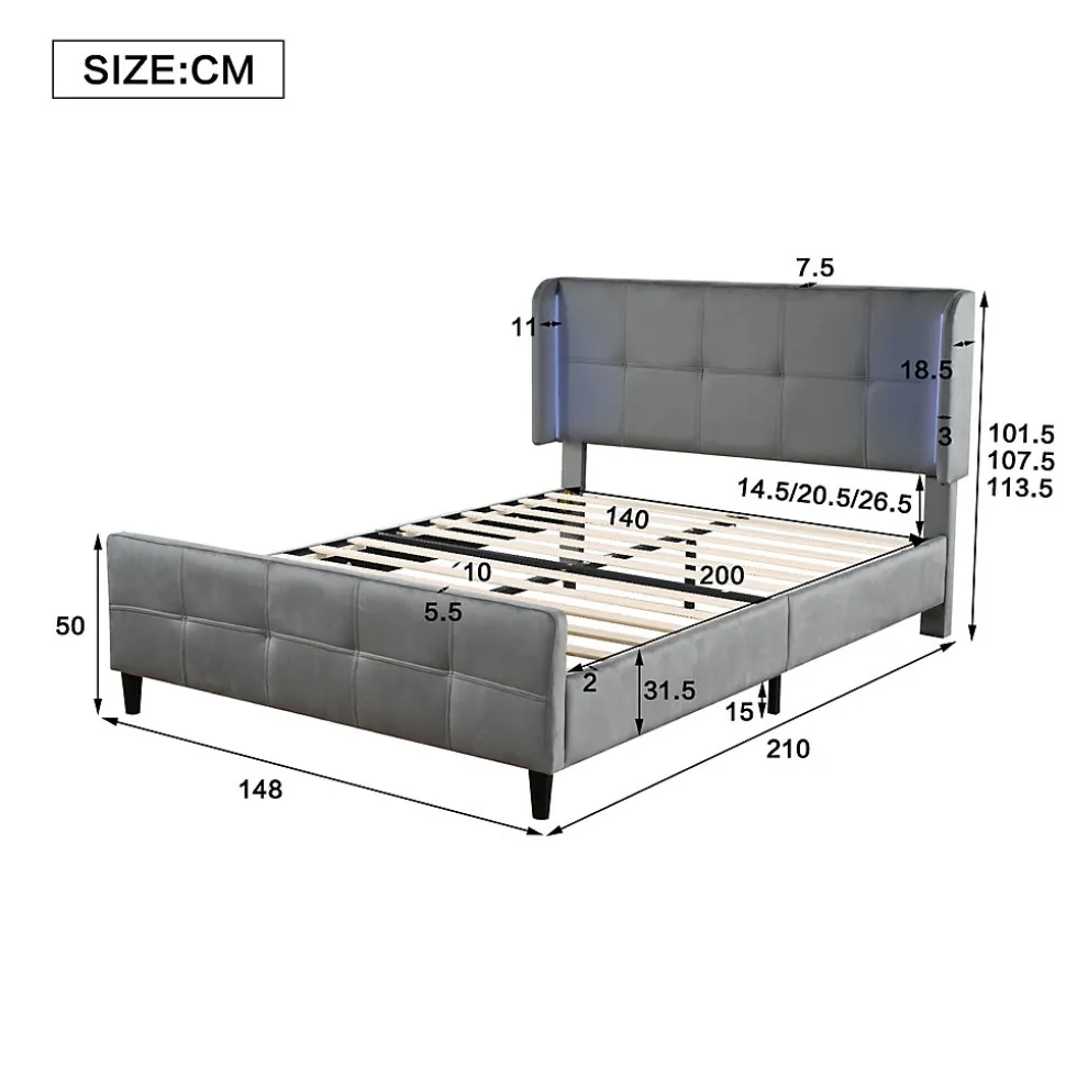 ▶ ▶ Détails ▶────────────────● Nom du produit : Lit double● Taille totale : 210 x 148 x 101,5/107,5/113,5 cm● Poids total : 35 kg● Hauteur sous le lit : 15 cm●● Matelas ●●▪ Matelas compatible (Matelas non inclus) : 140 x 200 cm● Capacité de charge : 200 kg● Couleur : Gris● Matériaux : Velours, Métal, MDF● Matériau des lattes : Bois● Montage requis : Oui● Nombre de colis : 2► Remarques ►※ Ce produit est livré en 2 colis. Ils peuvent ne pas arriver en même temps. Veuillez patienter.※ En raison de mesures manuelles, une erreur de 2 à 3 cm peut survenir.※ Toutes les images des produits sont prises avec de vrais produits, mais en raison de l’influence de la lumière solaire et d’autres facteurs, il peut y avoir de légères différences de couleur.※ Si vous avez des questions lors de l’installation, veuillez nous contacter dès que possible.