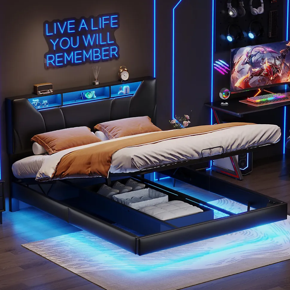【Éclairage LED】 : l’éclairage double LED ajoute un style moderne à votre chambre à coucher, avec la télécommande, vous pouvez changer les différentes couleurs et luminosités pour vous allonger confortablement.【Station de charge avec port USB et Type-C】: L’une des caractéristiques les plus utiles est la prise USB et Type-C intégrée à la tête du lit, de sorte que vous pouvez charger votre téléphone portable et votre tablette avant d’aller vous coucher. L’espace de rangement sur la tête de lit peut être utilisé pour ranger des téléphones portables et d’autres objets.【Fonction de stockage pratique】: Notre lit coffre 140×200 offre un rangement puissant. Il dispose d’un levier hydraulique qui vous permet de le soulever facilement et de stocker des objets du quotidien tels que des caisses, des couvertures, des vêtements, etc. Il y a un coffre sous le lit pour éviter la poussière.【Soutien doux et confortable】: Le lit coffre, avec une hauteur de tête de lit pouvant atteindre 105 cm, offre non seulement une structure solide, mais aussi un confort moelleux qui soutient votre corps lorsque vous vous appuyez contre la tête de lit.【Informations détaillées】 : Pour réduire les risques de dommages pendant le transport, ce cadre de lit est livré en 2 colis qui peuvent arriver à des dates différentes. Veuillez contacter notre service client si des pièces sont manquantes.&Poids et dimensions&● Dimensions totales:146x202x105cm(LxLxH)● Matelas applicable (matelas non inclus):140×200 cm● Couleur : gris● Poids du produit:46.7 kg● Nombre de sommiers à lattes:12pcs● Matériau:PU● Capacité de poids:300 KG● Numéro de colis:2 ● Assemblage requis:Oui&Remarques&※ En raison de la mesure manuelle, un écart de 2 à 3 cm peut se produire.※ En raison de l’influence de la lumière du soleil et d’autres facteurs, il peut y avoir de légères différences de couleur.※ Ce produit sera expédié en 2 colis. Ils peuvent arriver à des moments différents. Veuillez patienter.
