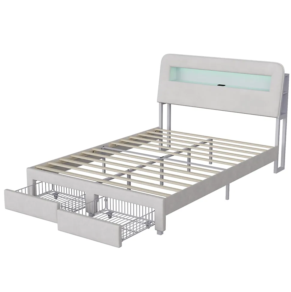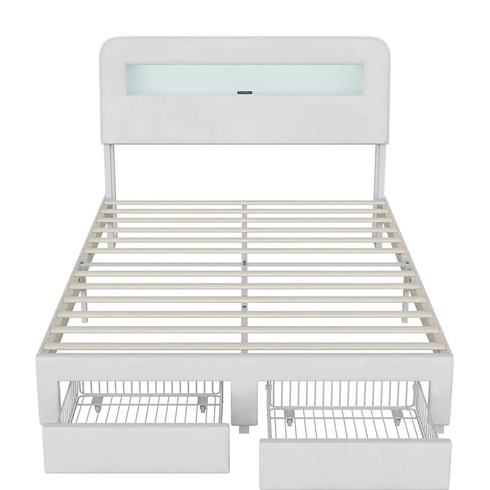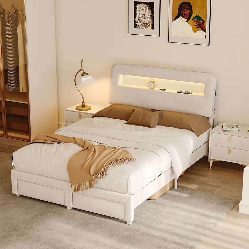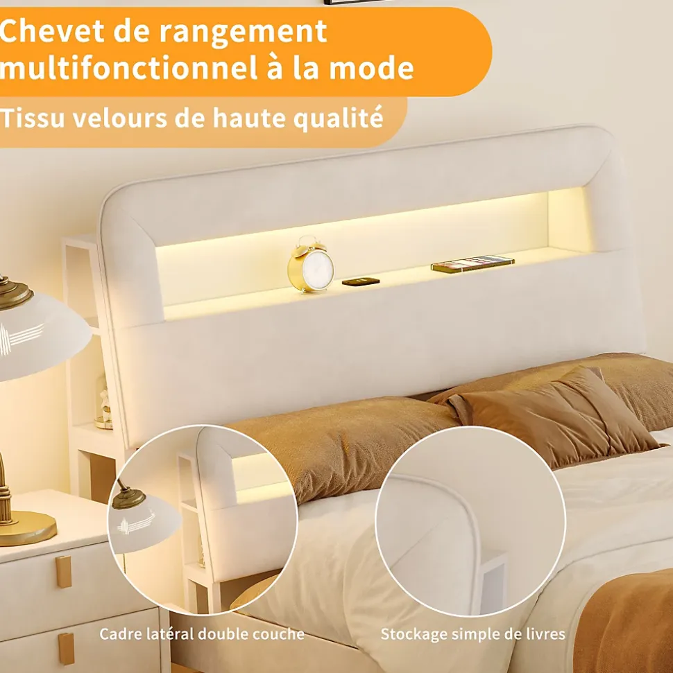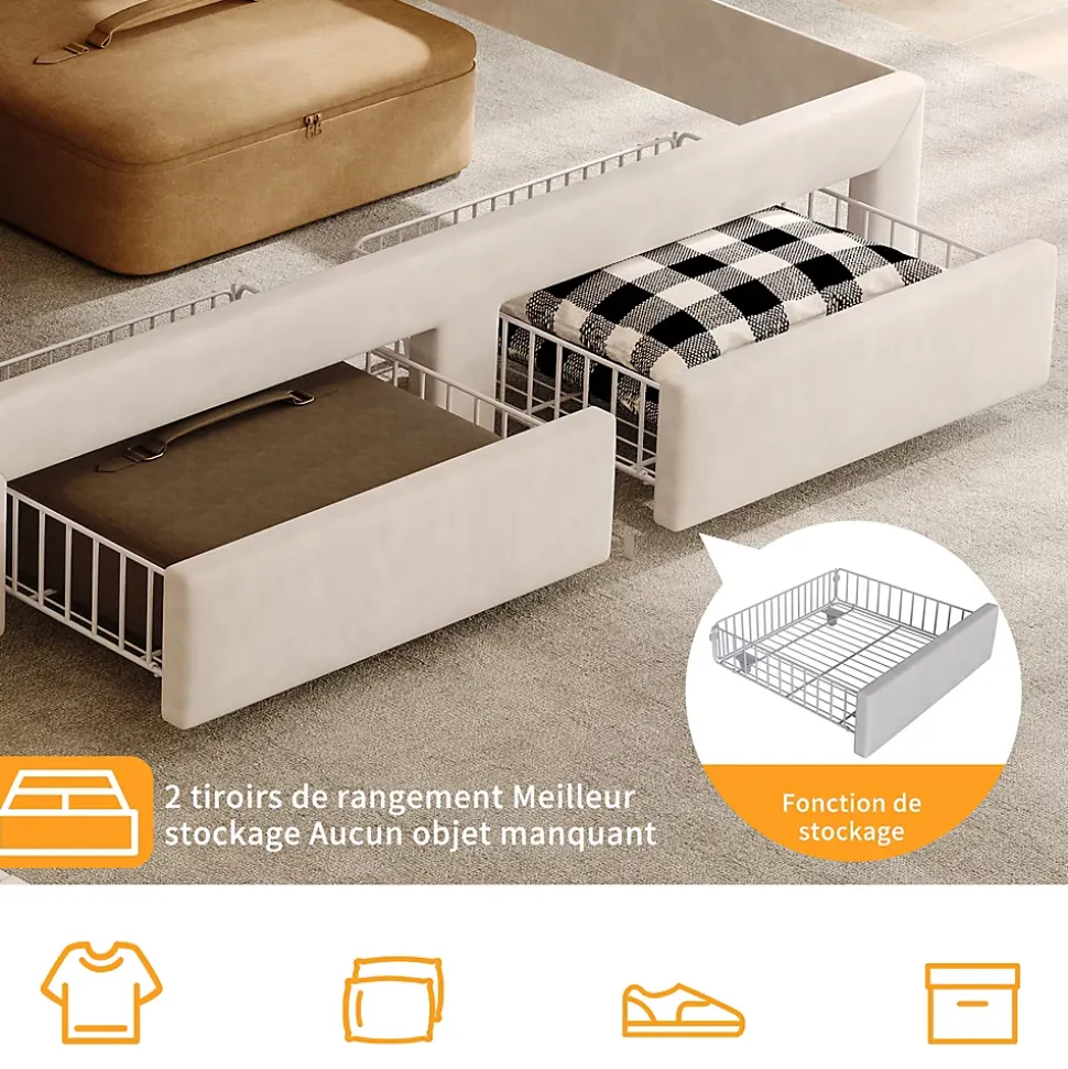 【Design moderne et élégant】 : Ce lit double en velours beige séduit par son style contemporain et raffiné. Sa tête de lit capitonnée avec éclairage LED intégré apporte une ambiance chaleureuse et personnalisable à votre chambre.【Espace de rangement optimisé】 : Doté de deux tiroirs spacieux sur roulettes au pied du lit, il offre un rangement pratique pour le linge de lit, les vêtements ou les objets du quotidien, idéal pour maximiser l’espace dans les petites chambres.【Confort supérieur】 : La tête de lit et les côtés rembourrés en velours doux procurent une sensation agréable au toucher. Le dossier légèrement incliné assure un excellent confort pour lire, regarder un film ou se détendre.【Tête de lit multifonctionnelle】 : Intègre des ports USB pour recharger facilement vos appareils électroniques, ainsi que plusieurs compartiments latéraux pour ranger vos livres, lunettes ou objets décoratifs à portée de main.【Livraison en deux colis】Pour minimiser les risques de dommages, le lit est expédié en deux colis séparés, pouvant arriver à des dates différentes. Pour toute question, notre service client est à votre disposition avec plaisir