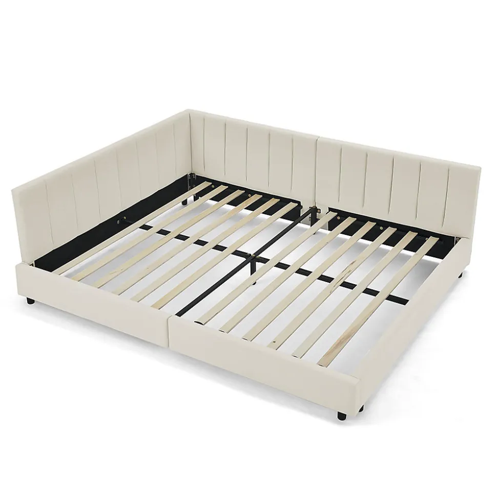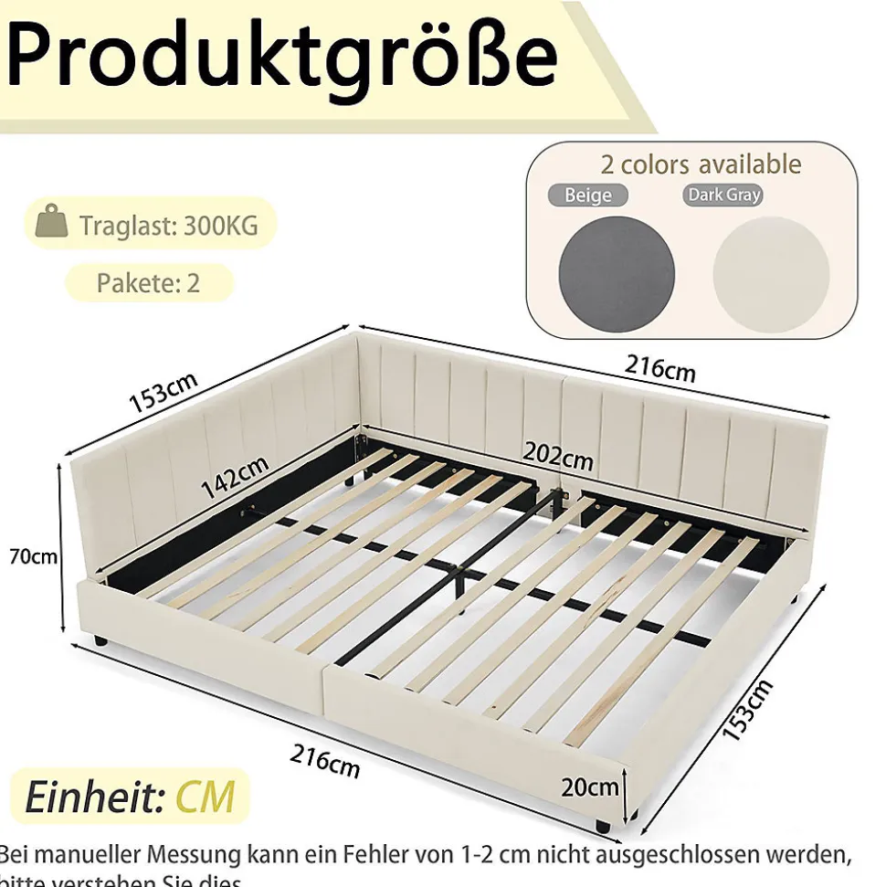 Caractéristiques du produitDimensions du produitLongueur assemblé (cm) : 216,00Largeur une fois assemblé (cm) : 153,00Hauteur une fois assemblé (cm) : 70,00Poids du produit (kg) : 46,00Dimensions de l’emballageSous-article 1 : 147 * 54 * 16 cm 27 kgSous-article 2 : 109,5 * 67 * 21,5 cm 25 kgInformations sur le produitLieu d’origine : ChineCouleur principale : beigeMatériau principal : mousseUtilisation : chambre à coucherDimensions du lit : 140 cm*200 cmType de lit : cadre de litType de bois : eucalyptusMatériau du revêtement : velours