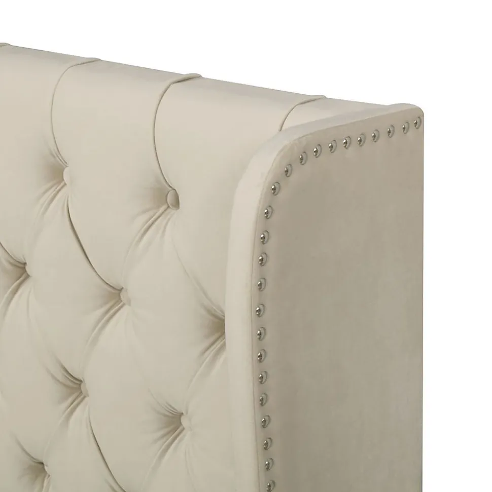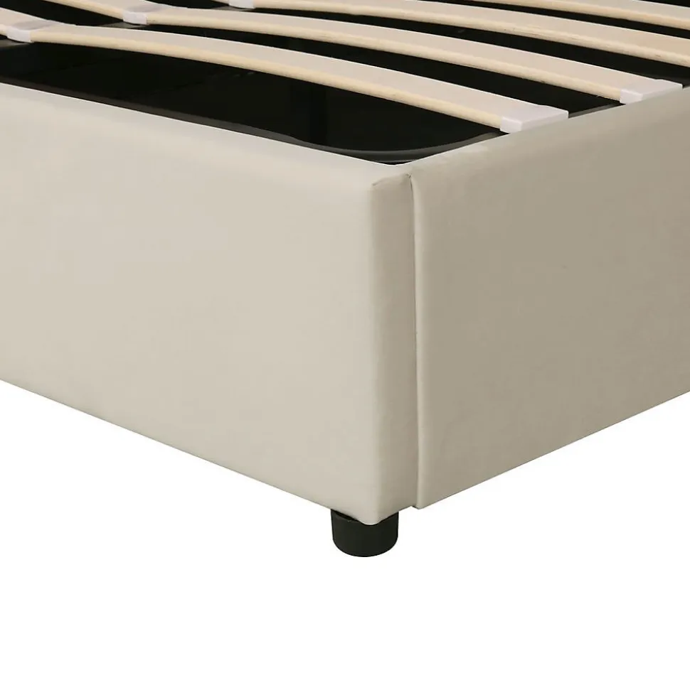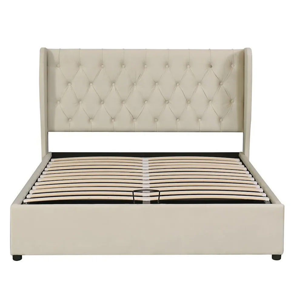 Lit double rembourré 140×200 cm – Velours beige (style Chesterfield)Dimensions: 207(L) x 146(P) x 99(H) cm Capacité max: 300 kg Matériaux:Structure: Bois massif + acierRevêtement: Velours anti-tachesSommier: Lattes en pinCaractéristiques: ✔ Tête de lit haute avec oreilles stylisées ✔ Coffre hydraulique (rangement intégré) ✔ Design boutonné style Chesterfield ✔ Montage facile (1h environ)Livraison: 2 colis:198x26x20.5 cm (24.1 kg)142.88×59.28×12.09 cm (25.3 kg)Compatibilité: Matelas 140×200 cm (non inclus)
