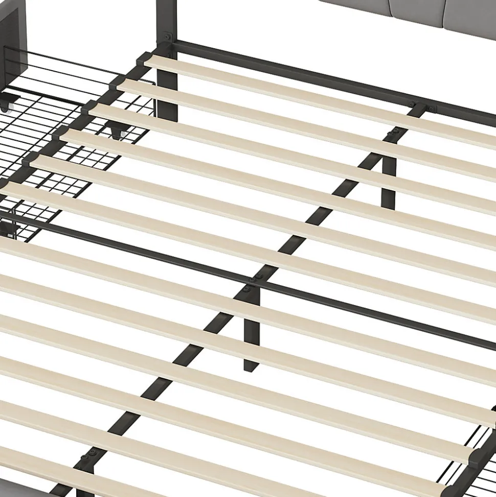 Description du produit Ce lit double présente un design moderne et épuré, alliant fonctionnalité et esthétique. Son sommier à lattes robuste assure un bon soutien et une bonne respirabilité du matelas, créant ainsi une base solide pour un sommeil réparateur. La tête de lit unique est non seulement réglable en hauteur pour s’adapter à différentes morphologies, mais elle est également recouverte d’un fin velours gris doux au toucher qui crée une atmosphère subtile et luxueuse. Quatre tiroirs sont astucieusement intégrés sous le pied du lit et offrent un espace de rangement supplémentaire. Qu’il s’agisse de linge de lit saisonnier, de vêtements ou d’effets personnels, ils peuvent être rangés avec soin et assurent une chambre plus organisée. Le design global privilégie le confort et la fonctionnalité. C’est le choix idéal pour ceux qui apprécient la qualité de vie et veulent donner à leur chambre paix et élégance. Détails du produit : – Matériaux : Bois + Métal + Velours – Dimensions (L x P x H) : 209,5 x 164,5 x 99-109 cm. – Poids total du produit : 48,1 kg – Charge maximale : 250 kg. Surface de couchage : 160 x 200 cm (sans matelas). – Couleur : Gris – Type de cadre de lit : Sommier à lattes inclus. Niveau d’assemblage : Assemblage complet requis / Assemblage partiel. – Outils supplémentaires requis : Tous les outils inclus / Tournevis. La livraison comprend : 1 x lit double. 1 x Manuel d’instructions (éventuellement non en allemand). Remarques : 1. De légères différences de dimensions sont possibles en raison de la mesure manuelle. 2. Pour des raisons logistiques, l’heure de livraison des deux colis peut être différente. Merci de votre compréhension.