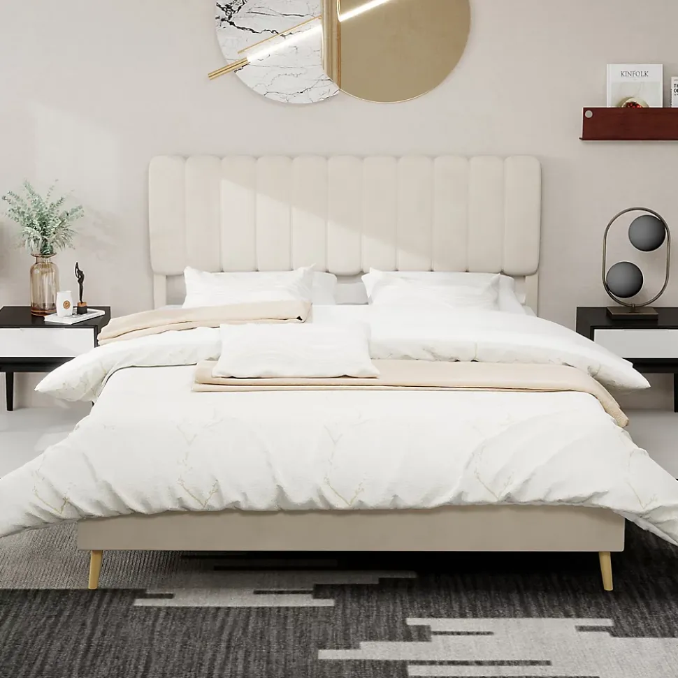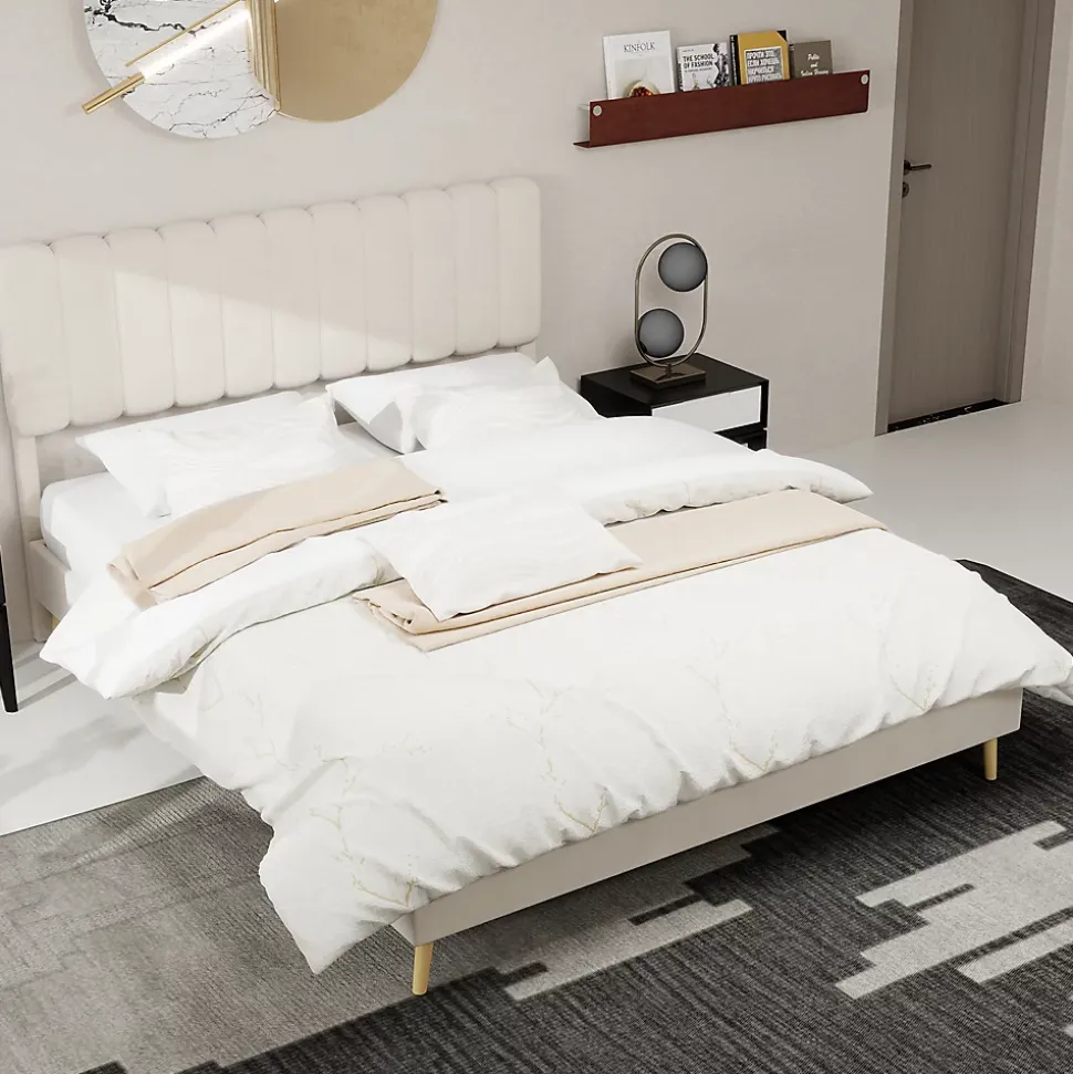▶ ▶ Détails ▶────────────────● Type de produit : Lit double● Matériau : Tissu (velours néerlandais) + Métal● Couleur : Beige● Dimensions du produit : 200 × 160 × 133 cm● Poids du produit : 27,50 kg● Nombre de colis : 2● Type : Cadre de lit avec base basse anti-poussière, tête de lit douce, sans matelas● Rembourrage : Mousse à mémoire de forme● Matériau du cadre : Matériau composite► Remarques ►※ Toutes les dimensions sont approximatives.※ En raison des conditions d’éclairage, des variations de couleur peuvent apparaître entre les images du produit et le produit réel.※ Veuillez vérifier les dimensions avant l’achat.