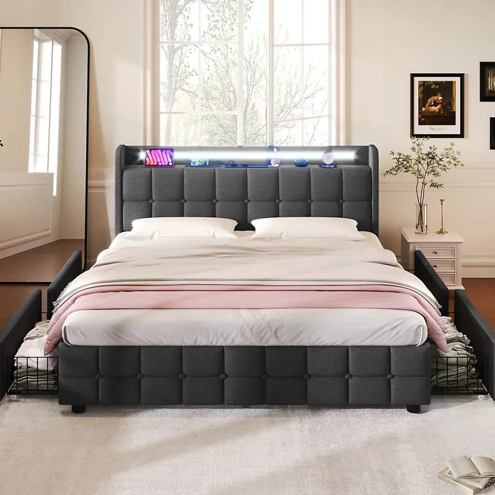 【Tête de lit avec prises de courant et ports USB】l’une des caractéristiques les plus pratiques de ce lit est la prise de courant intégrée à la tête de lit, qui vous permet de charger votre téléphone et votre tablette avant de vous coucher. Chaque prise de courant dispose de deux ports de charge standard de l’UE et de deux ports USB.【Éclairage LED 】L’éclairage LED ajoute une touche de modernité à votre chambre à coucher. Avec la télécommande, vous pouvez choisir parmi différentes couleurs et intensités lumineuses pour vous détendre en toute commodité.【Design de rangement 】Ce lit est équipé de 4 grands tiroirs de rangement. Les côtés du lit sont munis de fermoirs de tiroir, permettant de fixer solidement le tiroir au lit lorsqu’il n’est pas utilisé, pour garder votre chambre bien rangée. Les boîtes de rangement sont faciles à faire glisser grâce aux roulettes situées au bas.【Praticité et design】 Ce lit allie design élégant et confort ultime. Les boutons décoratifs ajoutent une touche moderne à la tête de lit. La structure du lit est principalement en fer, durable et capable de supporter jusqu’à 600 livres. Les pieds de support supplémentaires de la barre centrale garantissent une stabilité fiable du lit.Spécifications du produit :Dimensions totales : 164,5x220x103,5 (LxLxH)Matelas applicable (matelas non inclus) : 160×200 CMDimensions intérieures des tiroirs : 74,5×49,5×15 (LxLxH)Espace de tête de lit : 25cmPoids maximal de l’utilisateur : 600 LBSNombre de colis : 2Assemblage requis : OuiDétails du produit :Type de produit : lit capitonné + tiroir, avec fonction de charge + fonction d’éclairage LEDMatériau de la plaque : Matériau en linCouleur : Beige / GrisType de charge : 2 USB + 2 prisesContenu de l’emballage : Cadre de lit + Prises + Tiroirs*4Design unique : Fonction de chargement + Éclairage LED