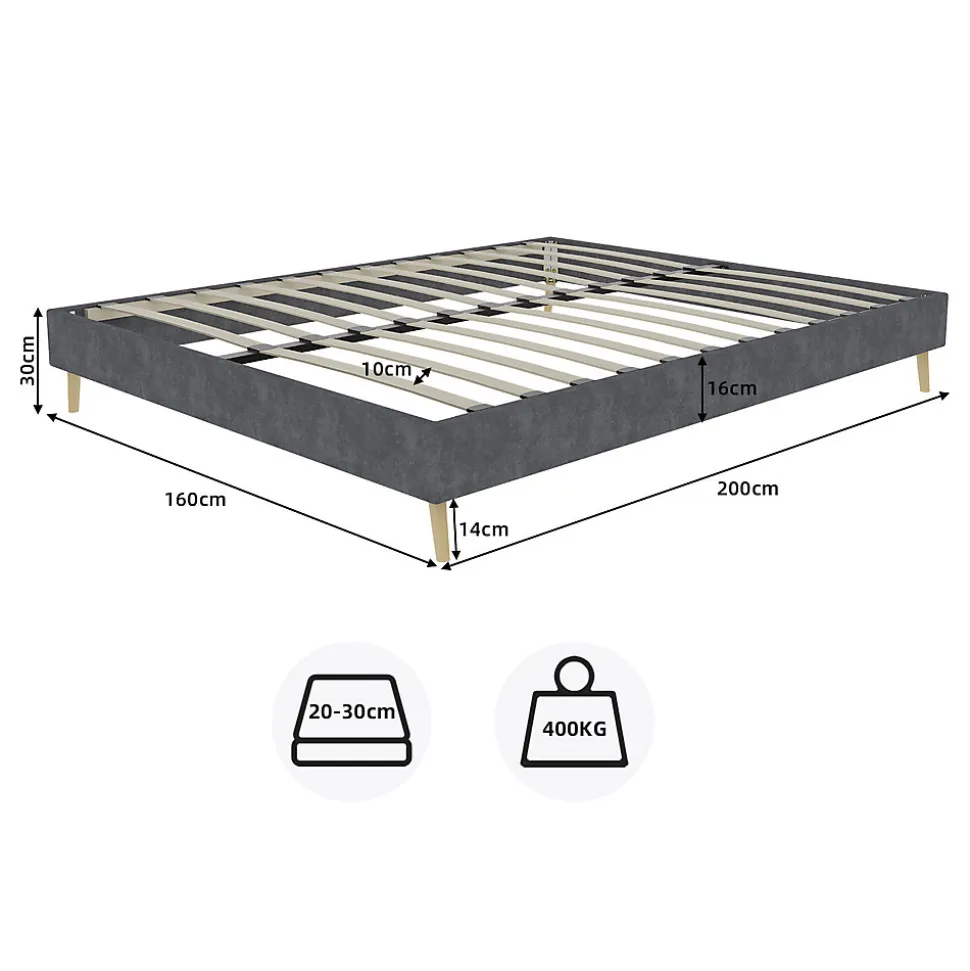 ▶ ▶ Détails ▶────────────────● Type de produit : Lit double● Matériau : Tissu (velours néerlandais) + Métal● Couleur : Gris● Dimensions du produit : 200 × 160 × 14 cm (L × l × H)● Poids du produit : 19,00 kg● Nombre de colis : 1● Type : Cadre de lit (sans vérin à gaz, tête de lit ni matelas)● Remplissage : Mousse à mémoire de forme● Matériau du cadre : Matériau composite● Vérin à gaz : Non inclus► Remarques ►※ Toutes les dimensions sont approximatives.※ En raison des conditions d’éclairage, des variations de couleur peuvent exister entre les images du produit et le produit réel.