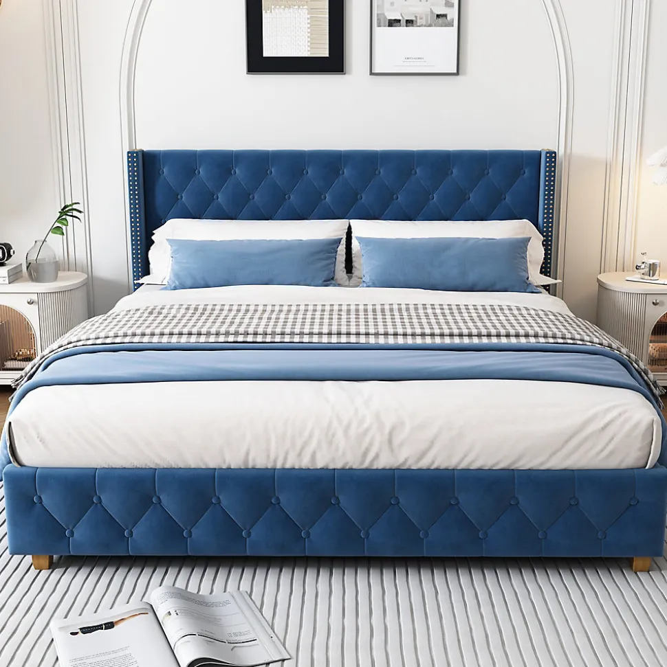 ▶ ▶ Détails ▶────────────────● Dimensions totales : 205 x 169 x 108 cm (L x l x H)● Taille du matelas compatible : 160 x 200 cm (Sans matelas)● Couleur : Bleu● Matériau principal : Velours● Capacité de charge maximale : 300 kg● Nombre de lattes : 12 pièces● Épaisseur de matelas recommandée : 27,5 cm● Temps de montage estimé : 40 minutes● Poids net : 44 kg● Nombre de colis : 2● Accessoires inclus : Structure de lit, visserie et outils, manuel d’installation● Pays d’origine : Chine► Remarques ►※ Ce produit est expédié en 2 colis, qui peuvent arriver à des moments différents. Merci de votre patience.※ Une marge d’erreur de 2 à 3 cm peut survenir en raison de mesures manuelles.※ Les photos sont prises à partir de produits réels. Toutefois, des écarts de couleur peuvent apparaître en raison de l’exposition à la lumière ou d’autres facteurs.※ Si vous avez des questions lors de l’installation, veuillez nous contacter dès que possible.
