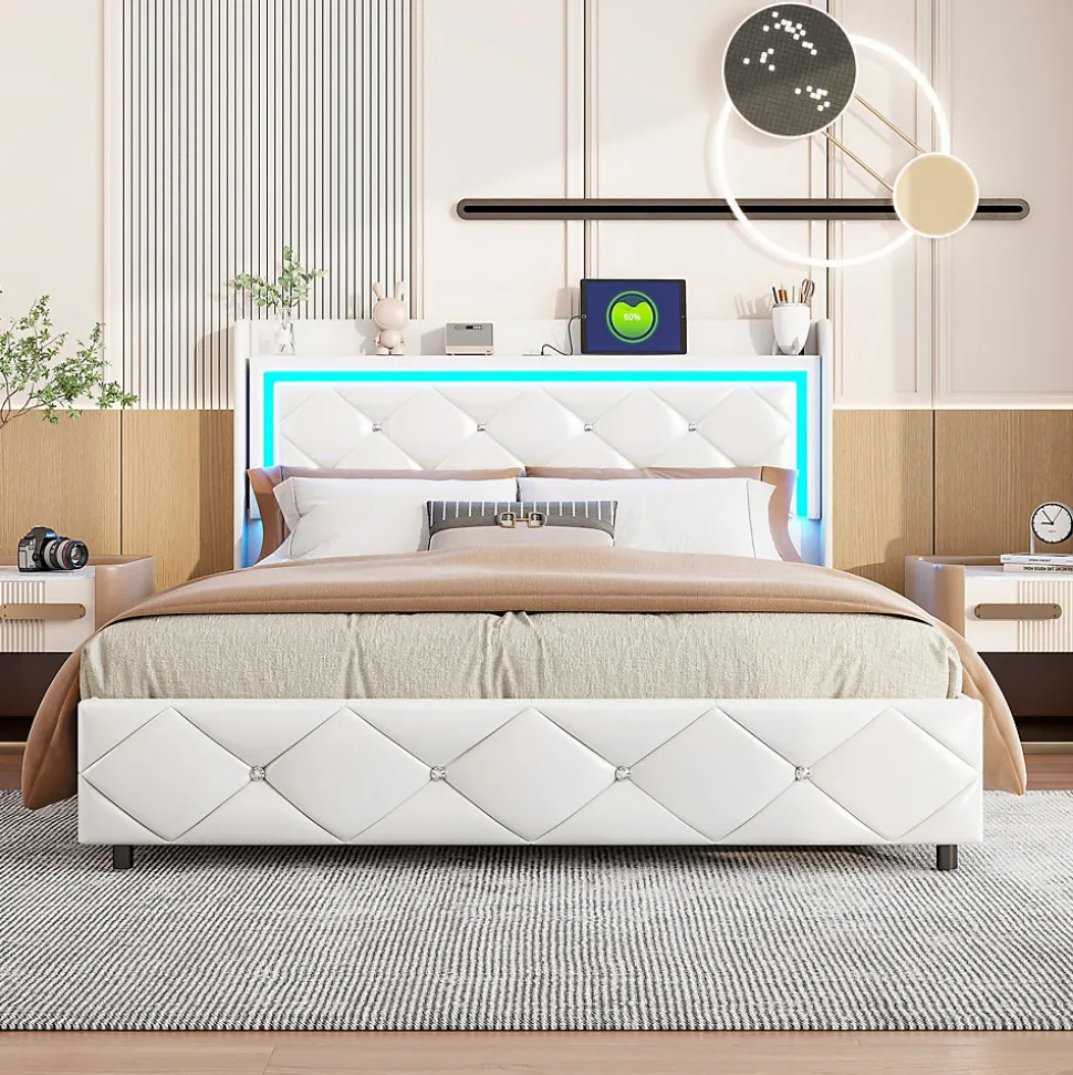 Caractéristiques du produit: 【Tête de lit multifonctionnelle】 : Équipée d’une lumière LED, changeable selon vos préférences avec la télécommande, ajoutant une touche de modernité à votre chambre. L’une des caractéristiques les plus utiles est la prise USB intégrée à la tête du lit, qui vous permet de recharger votre téléphone portable et votre tablette avant d’aller vous coucher 【Design élégant】 : Ce lit rembourré a un design à la fois classique et moderne, il s’harmonise avec différents styles d’intérieur. C’est l’ajout idéal pour votre chambre ou chambre d’amis. 【Structure solide】 : La robustesse de son cadre en fer, capable de supporter 340 kg, garantit sa stabilité. Les sommiers à lattes, composées de lattes en bois massif, offrent un soutien optimal pour un sommeil réparateur. 【Lit pratique avec rangement】 : Grâce à son système de levage hydraulique double, ce lit offre un espace de rangement considérable sous le matelas,particulièrement adapté aux petites maisons ou appartements avec un espace limité, résolvant efficacement les problèmes de place dans les petits logements. 【Informations importantes】 : Pour minimiser les risques de dommage, ce lit est livré en 2/3 cartons qui peuvent arriver à des jours différents. En cas de pièces manquantes, veuillez contacter le service client.Spécifications Dimensions totales du produit : 205 x 164.5 x 114 cm Nombre de paquets : 2 Détail des dimensions du produit : Veuillez vous référer à l’image de la taille Poids total du produit : 47 KG Capacité de poids : 340 kg Épaisseur de matelas recommandée : 20-30 cm Matelas inclus : non&Remarques&※ En raison de la mesure manuelle, un écart de 2 à 3 cm peut se produire.※ En raison de l’influence de la lumière du soleil et d’autres facteurs, il peut y avoir de légères différences de couleur.※ Ce produit sera expédié en 2 colis. Ils peuvent arriver à des moments différents. Veuillez patienter.