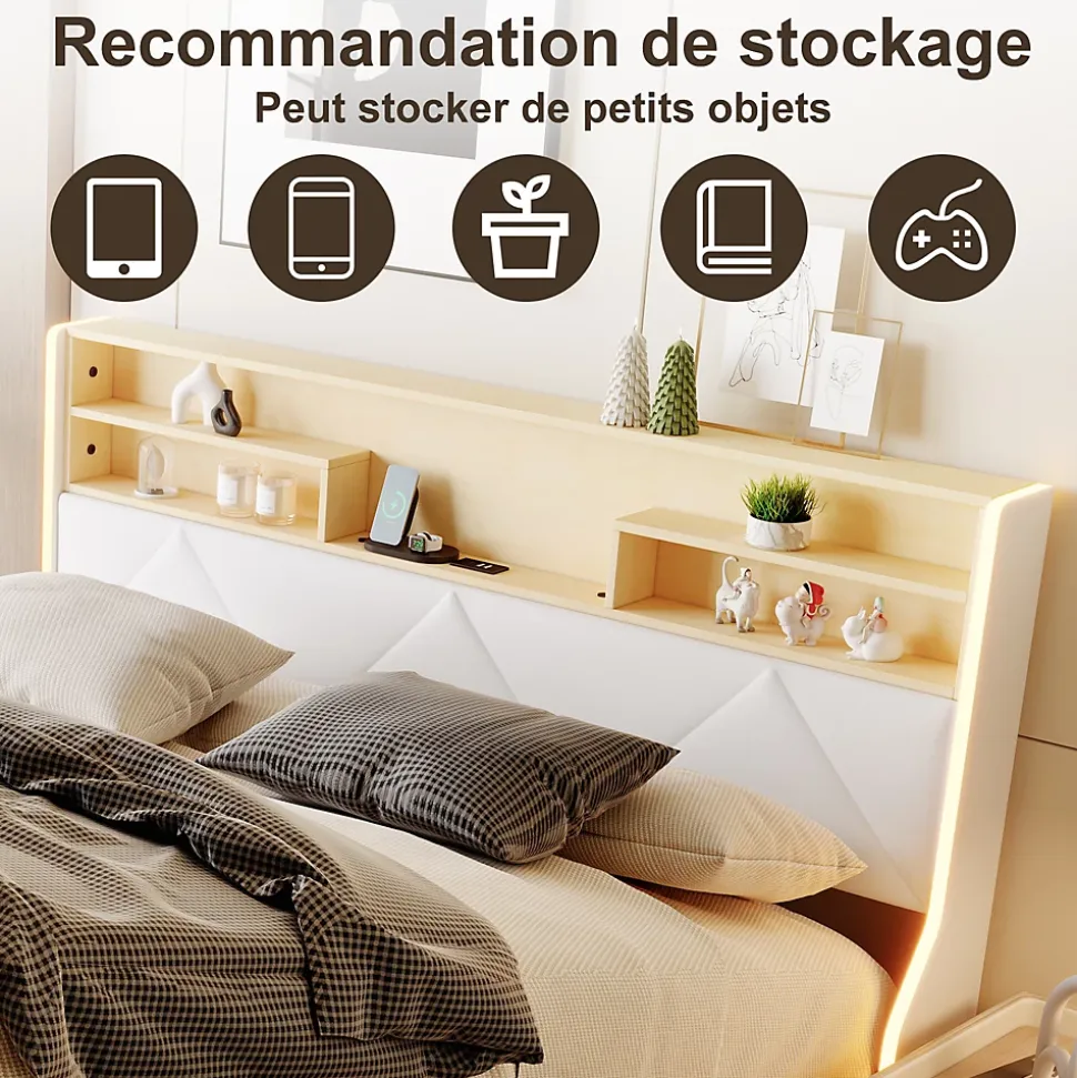 【Design moderne et élégant】 : Ce lit double en similicuir se distingue par sa tête de lit à motifs géométriques raffinés, apportant une touche de modernité et de sophistication à votre chambre. Son design sobre s’intègre parfaitement dans les intérieurs contemporains.【Grand espace de rangement 】 : Le système d’ouverture à vérin hydraulique permet d’accéder facilement à un vaste espace sous le sommier, idéal pour ranger couettes, oreillers ou autres objets volumineux. La tête de lit offre également des compartiments pratiques pour garder vos essentiels à portée de main.【Fonctionnalités modernes】 : La tête de lit est équipée d’un port USB intégré pour recharger vos appareils électroniques, tandis que les bandes LED latérales ajoutent une lumière d’ambiance douce et un effet décoratif élégant.【Durabilité et confort】 : Fabriqué à partir de matériaux de haute qualité, ce lit allie robustesse et confort. Le revêtement en similicuir est à la fois résistant, agréable au toucher et facile à entretenir, assurant une longue durée de vie au produit.【Montage facile et entretien simplifié】 : Livré avec un manuel d’instructions clair, ce lit est simple à assembler. Sa surface en cuir synthétique se nettoie aisément avec un chiffon humide, vous permettant de maintenir votre chambre propre et soignée en toute simplicité.