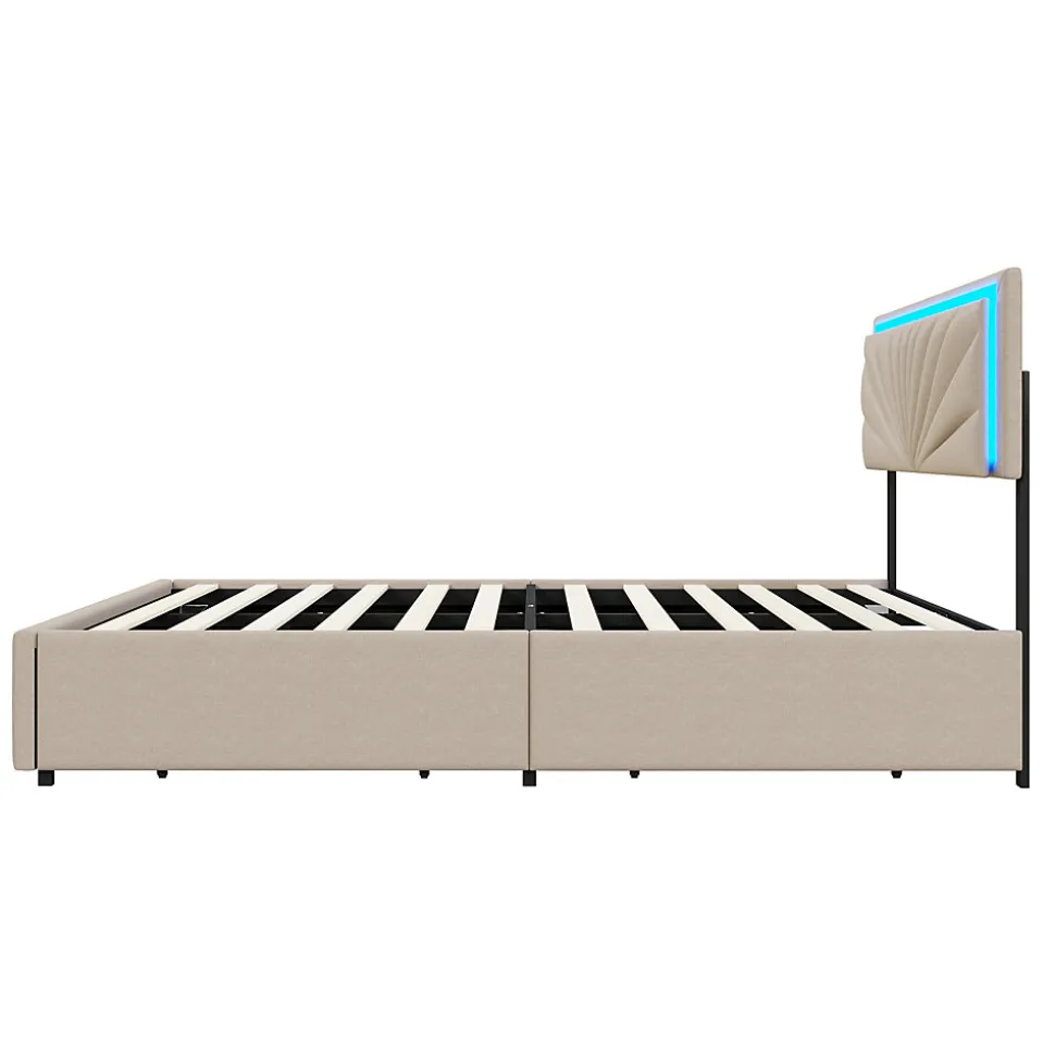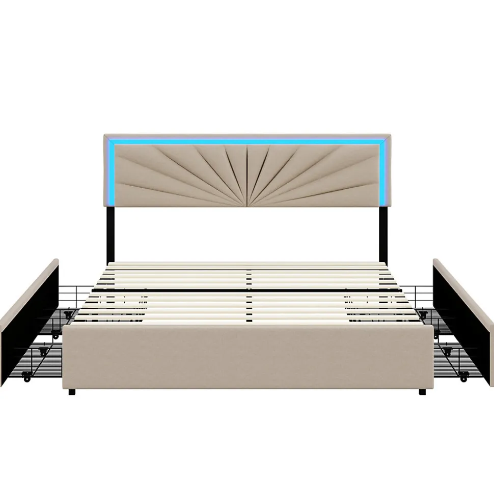 Description du produitUne tête de lit avec éclairage LED crée une atmosphère chaleureuse dans votre chambre et offre un endroit confortable pour s’appuyer pour lire et se détendre avant de se coucher. La structure solide du sommier à lattes prolonge la durée de vie de votre matelas en latex, en mousse à mémoire de forme ou à ressorts sans avoir besoin d’un lit à sommier tapissier. Sous le lit se trouvent 4 grands tiroirs push-pull qui couvrent vos besoins de rangement quotidiens et vous aident à garder la pièce bien rangée et propre. Le lit double fortuna Lai augmente votre bien-être. Détails du produit : – Matériau : lin. – Dimensions (l x p x h) : 208 x 169 x 106,5 cm. – Poids : 40 kg. – Charge maximale : 250 kg. Surface de couchage de 160 x 200 cm (sans matelas). – Nombre de lamelles : 12. Contenu de l’emballage : 1 lit. 1 mode d’emploi (français non garanti). Remarques : – Et l’ensemble du produit est livré en 2 paquets et peut arriver à des jours différents. Veuillez être patient pour la livraison complète. Les coussins, les couvertures et les objets de décoration représentés sur la photo ne sont pas inclus