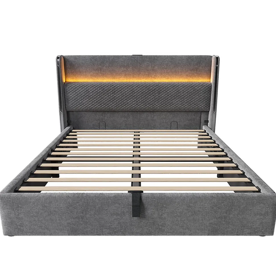 Caractéristiques du produitDimensions du colisSous-article 1 : 173,99 * 31,98 * 23,5 cm 25,55 kgSous-article 2 : 173,99 * 37,49 * 19 cm 28,85 kgDescriptionsDimensions totales 221 x 173 x 121 cm (L x l x H)Matériau du plateau Lin + bois + métalCouleur GrisMatelas compatible (matelas non inclus) 160 x 200 cmÉpaisseur recommandée du matelas 20-25 cmPoids maximal de l’utilisateur 200 kg / 440 lbSommier à ressorts nécessaire NonAssemblage nécessaire OuiContenu du colis Cadre de lit + LED + station de rechargeNombre de colis 2Poids brut/poids net 54,5 kg/48,4 kgDesign unique Lit hydraulique avec tête de lit hauteType de charge USB + Type C
