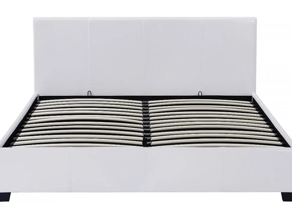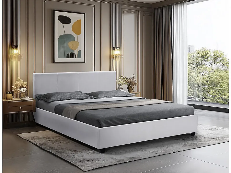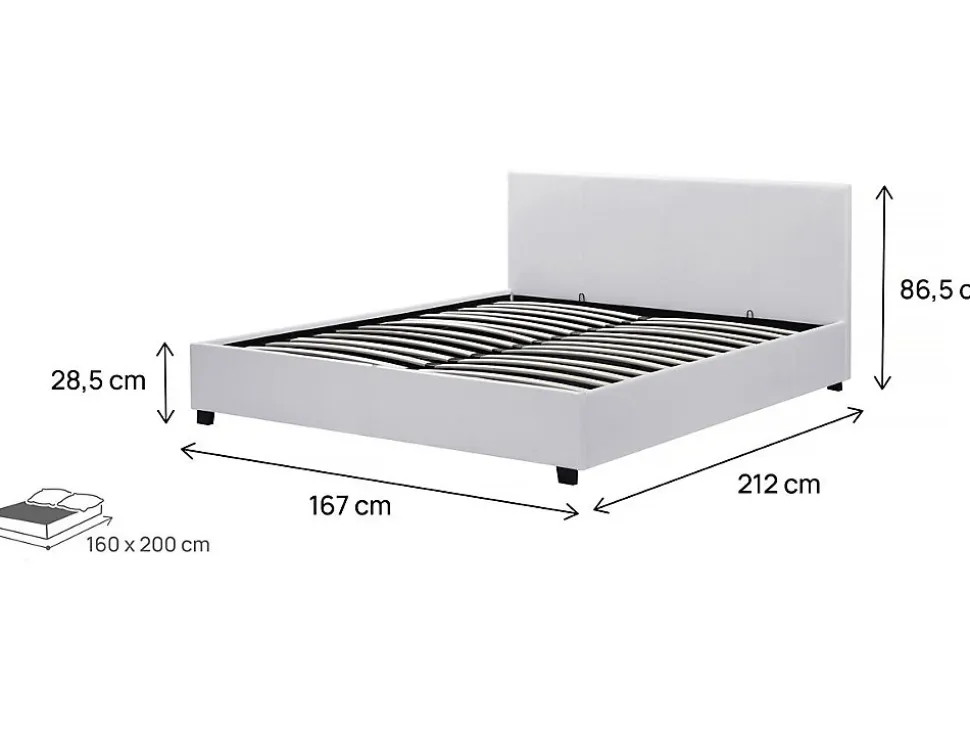 Lit « Carla »Offrez-vous un moment de détente avec ce lit double ! Idéal pour tous les univers de décoration, il ira à ravir avec votre chambre. Ajoutez un matelas de notre gamme et passez un instant privilégié dans votre petit chez vous. C’est cadeau !Un coffre de rangement intégré vous permettra en plus de dissimuler toutes vos affaires !Existe en plusieurs dimensions. Existe en plusieurs coloris. Lit coffre double « Carla » – Blanc – Coffre de rangement en toile – Dimensions lit : 213 x 167 x 86 cm – Dimensions matelas : 160 x 200 cm – Sommier inclus .Descriptif: Apportez un changement à votre quotidien avec notre lit Carla – Sommier à lattes et tête de lit inclus – Matelas vendu séparément – Fond du coffre en toileMatière(Filtre): Simili cuirMatières: Simili cuirCouleurs: blanccouleur (filtre): BlancDimensions: 213 x 167 x 86 cmDimensions du couchage: 160 x 200 cmDimensions (Filtre): 160 x 200 cmSommier: Dimensions lattes : 79 x 5.2 x 1 cm Nombre de lattes : 26 – ContreplaquéCoffres: 202 x 162 x 24 cm Fond du coffre en toilepieds: 6 x 3 x 5 cmPoids: 49 kgColisage: 2 colis : – 1,695 x 1,02 x 0,07 m, 17 kg – 2,1 x 0,275 x 0,155 m, 32 kg