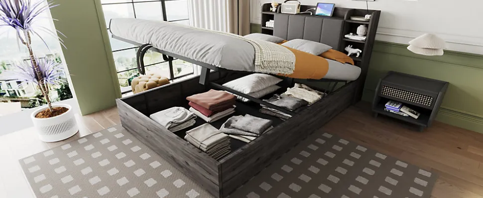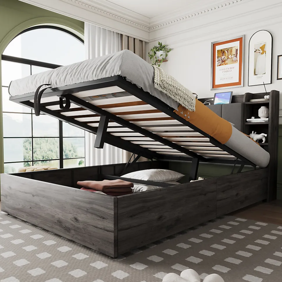 Fonction de rangement hydraulique : Ce lit simple dispose d’une structure hydraulique permettant d’optimiser l’espace. Sous le lit, vous pouvez ranger des vêtements, du linge de lit et d’autres objets. (Avant utilisation, il faut d’abord poser le matelas puis appuyer vers le bas.)Prise combinée USB et Type-C : Cette prise de charge pour lit hydraulique comprend 3 ports USB et 1 port Type-C, permettant de charger plusieurs appareils. (Avis de sécurité : utilisez de préférence 1 à 3 ports simultanément pour éviter toute surcharge électrique et tout accident.)Plusieurs compartiments : La tête de lit en bois dispose de plusieurs petits compartiments pour ranger différents objets tels que réveil, jouets, tasses ou décorations, répondant à divers besoins.Grand espace de rangement caché : Derrière le dossier rembourré de la tête de lit se trouve un grand compartiment pour ranger de gros objets. Le dossier est bien rembourré pour un confort optimal lorsqu’on s’y appuie. Idéal pour les studios ou petits appartements.