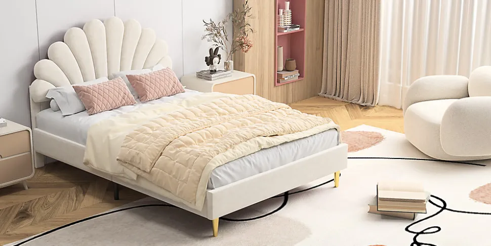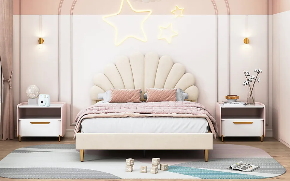 Design élégant : tapissé de velours soigneusement sélectionné et décoré avec des détails sophistiqués, ce lit plateforme s’intègre parfaitement dans n’importe quel décor d’intérieur et incarne une élégance intemporelle. Solide et robuste : notre lit plateforme est fabriqué en MDF et aggloméré de haute qualité. Un support métallique en forme de croix fournit un soutien dense et solide, offrant une capacité de charge allant jusqu’à 250 kg. Cette construction garantit non seulement une utilisation qui durera toute une vie, mais fournit également un cadre de lit robuste avec une tête de lit inébranlable. Découvrez le confort et la facilité d’utilisation inégalés qu’offre le lit tapissier 140×200. Une tête de lit en forme de fleur, recouverte de tissu velours, sert de dossier confortable et vous procure une sensation de confort. Dimensions : les dimensions totales du lit sont de 203 x 140 x 109 cm (L x l x H). Il est idéal pour un matelas de 140 x 200 cm (matelas non inclus) et peut supporter jusqu’à 250 kg. Montage facile : grâce à nos instructions de montage simples (français non garanti), l’installation est effectuée en quelques étapes seulement. Tous les outils nécessaires sont inclus dans la livraison.