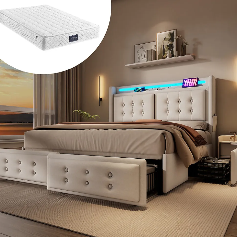 ▶ ▶ Détails ▶────────────────● Nom du produit : Lit double● Dimensions totales : 220 x 148 x 106 cm● Matériau : Bois + Coton + Métal● Couleur : Beige● Capacité maximale de l’utilisateur : 300 kg (660 lbs)● Matelas recommandé : 25 cm d’épaisseur● Montage requis : Oui● Contenu du colis : Cadre de lit + Sommier à lattes + 4 tiroirs● Caractéristiques uniques : Fonction de rangement + Éclairage LED● Dimensions des tiroirs latéraux : 50 x 45 x 13,5 cm● Dimensions du tiroir de fin : 50 x 45 x 13,5 cm● Type de charge : 2 prises + 1 USB + 1 Type C● Poids brut / Poids net : 51,7 kg / 45,8 kg● Nombre de colis : 2● Matelas ●● Dimensions totales : 140 x 200 x 25 cm● Structure du noyau : Matelas en mousse froide à 7 zones● Nombre de zones de couchage : 7● Densité : H3● Poids corporel max : 200 kg● Nombre de ressorts : 620 pcs● Positions de sommeil : Dormeur sur le ventre / sur le côté / sur le dos● Information allergique : Convient aux personnes allergiques aux acariens● Matériau de la housse : 100 % Polyester (200 g/m²)● Matériau de remplissage : Housse : Tissu double 100 % Polyester, Noyau : Ressorts ensachés + Mousse à vagues● Entretien : Aucun● Nombre de pièces : 1● Livraison : Enroulé● Nombre de colis : 3► Remarques ►※ Ce produit est livré en 3 colis. Ils peuvent ne pas arriver simultanément. Merci de patienter.※ En raison des mesures manuelles, un écart de 2-3 cm peut survenir.※ La couleur réelle peut légèrement différer des images en raison des conditions d’éclairage.※ Si vous avez des questions lors de l’assemblage, veuillez nous contacter rapidement.