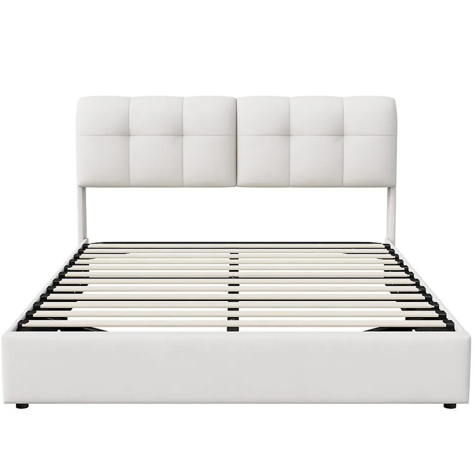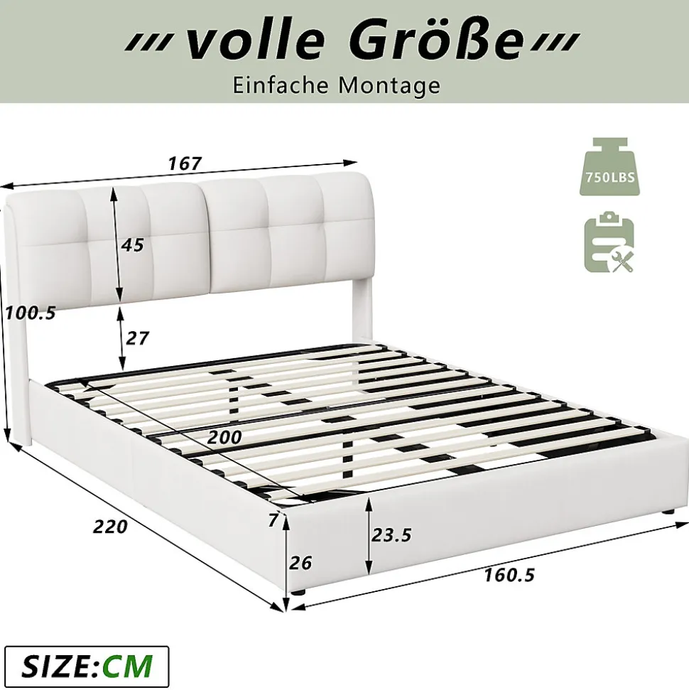 Design moderne: Notre lit de rangement moderne est équipé d’un système hydraulique, d’un sommier à lattes et d’un éclairage LED pour un sommeil réparateur dans votre chambre à coucher. La tête de lit est dotée d’un dossier rembourré pour vous permettre de vous appuyer confortablement.Tête de lit avec LED: ajoutez une touche de modernité à votre espace de sommeil avec cette tête de lit éclairée par LED. Sa lumière, modifiable par télécommande, donne le ton selon votre humeur et illumine subtilement votre espace nuitLit avec fonction rangement: Le coffre de lit sous le sommier à lattes pliant offre beaucoup d’espace pour ranger les couvertures, les oreillers ou les draps, et le sommier à lattes se replie facilement à l’aide du cylindre de levage.Structure solide: Le cadre principal du lit double est en fer et le sommier à lattes est composé de lattes élastiques en bois massif pour offrir un soutien confortable pendant le sommeil. Avec une capacité de charge de 330 kg, le lit assure la stabilité.Montage facile : Pour réduire le risque de dommages, ce lit est expédié dans 2 cartons et peut arriver à des jours différents. Vous pouvez l’installer en suivant les instructions claires (la version française n’est pas garantie).Détails du produitDimensions (L x l x H) : 220×140.5/160.5 x 100.5 cmCouleur: BeigeMatériau: Velours, Bois, MétalMatelas applicable (matelas non inclus) : 140/160×200 cmDistance de la tête de lit : 27 cmNombre de lamelles : 12Poids : 54 kg, 56.5kgPoids maximal supporté : 300 kgAssemblage requis : ouiQuantité du paquet : 2