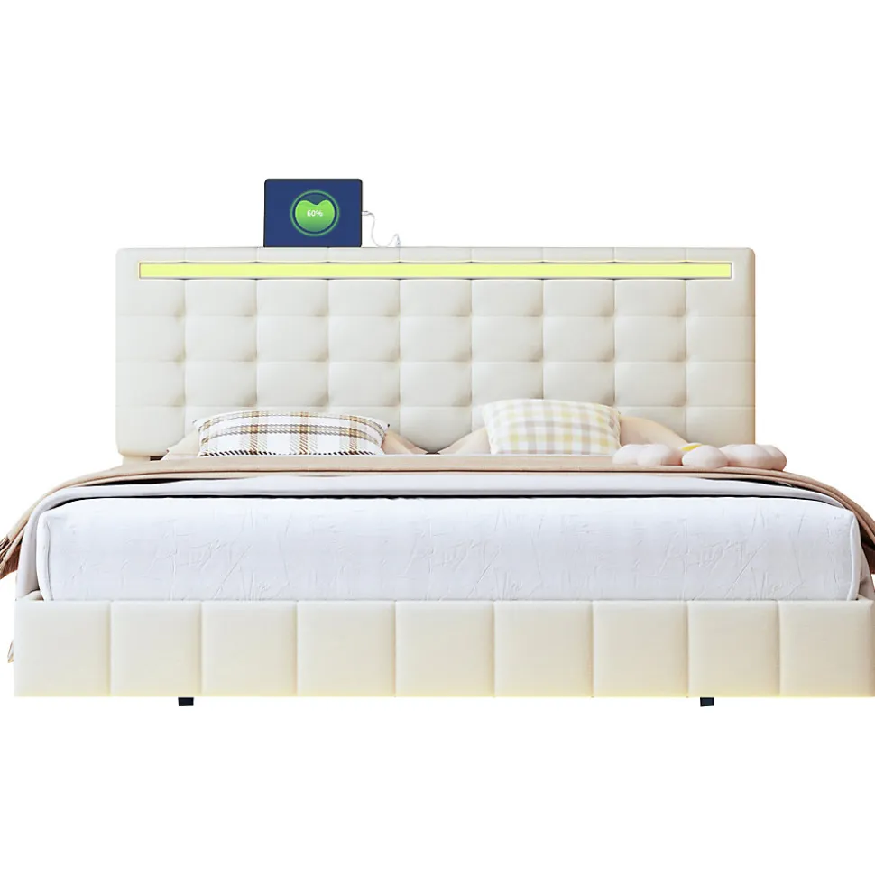 Lit double capitonné 160 x 200 cm, cadre de lit flottant, rembourré, avec LED, lin, beige