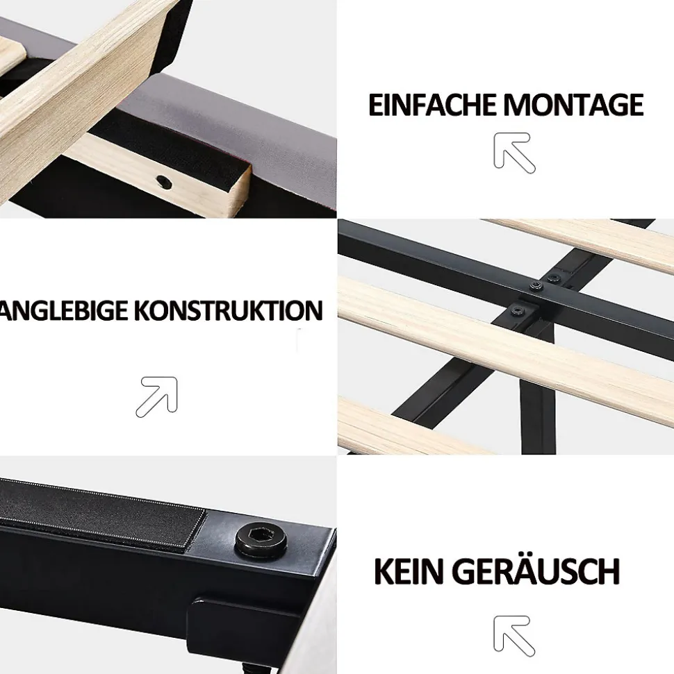 Construction robuste et durable : Le cadre de lit est fabriqué en MDF massif et panneaux de particules, soutenu par un support en métal en forme de croix robuste qui offre une base dense et sûre. Cela garantit une stabilité à long terme et empêche une tête de lit vacillante.Dimensions généreuses et capacité de charge élevée : Avec des dimensions de 210 x 172 x 100-105 cm, le lit offre suffisamment d’espace pour un sommeil réparateur. La capacité de charge élevée de 250 kg garantit que le lit reste stable même en cas d’utilisation par plusieurs personnes.Options de taille polyvalentes pour répondre aux besoins individuels : Le lit est disponible en deux tailles pour répondre aux différents besoins d’espace et s’assurer qu’il s’adapte à différentes tailles de pièce. Cela permet une conception flexible de la zone de couchage en fonction des préférences personnelles.