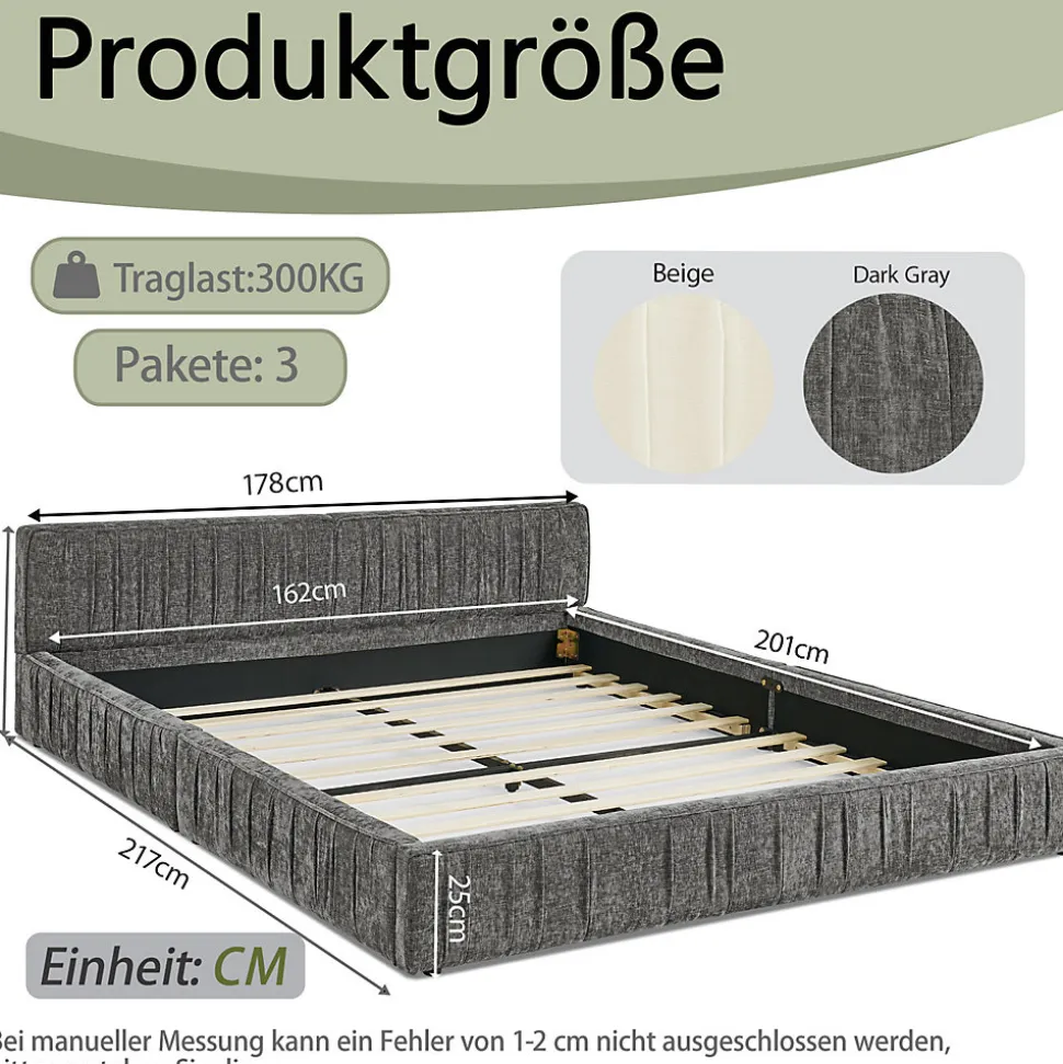 ▶ ▶ Détails ▶────────────────● Nom du produit : Lit double (matelas non inclus)● Pays d’origine : Chine● Couleur : Gris foncé● Matériau : Mousse● Dimensions du lit : 160 x 200 cm● Type de lit : Cadre de lit● Essence de bois : Eucalyptus● Revêtement : Chenille● Matériau du cadre : Fer● Utilisation : Chambre à coucher● Dimensions du produit : 217 x 178 x 59 cm (L x l x H)● Poids du produit : 38,5 kg● Nombre de colis : 3► Remarques ►※ Le matelas n’est pas inclus.※ En raison de mesures manuelles, un écart de 2 à 3 cm peut se produire.※ La couleur réelle du produit peut légèrement différer de celle des images en raison des conditions d’éclairage.