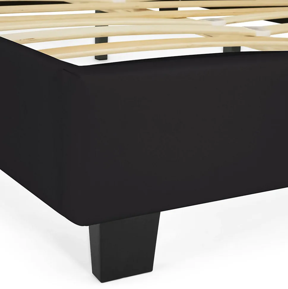 Aménagez votre chambre à coucher avec ce ravissant lit double CHARLOTTE avec sommier 140x190cm et son revêtement en PVC noir.Le design contemporain et élégant de ce lit saura se faire une place dans votre chambre ou dans une chambre d’amis. À la fois pratique et esthétique, le cadre de lit en PVC noir ainsi que ses quatre pieds en plastique peuvent être nettoyés très facilement ! Doté d’une grande tête de lit capitonnée, vous serez confortablement installé pour un moment de détente ou de lecture dans votre lit.Passez de douces nuits sur le sommier 24 lattes renforcé au niveau de la zone lombaire grâce au resserrement des lattes. La structure du lit en MDF est également stabilisée et renforcée par 2 pieds centraux en métal. N’attendez plus pour bien dormir et optez pour le lit double CHARLOTTE 140×190 cm avec sommier et son revêtement en PVC noir ! Dimensions du lit double CHARLOTTE 140×190 cm noir Dimensions globales : Longueur 198 cm x largeur 144 cm x Hauteur 76 cmDimensions de la tête de lit : L. 144 x pr. 4 x H. 52 cmDimensions standard pour un matelas 140 x 190 cm 2 placesHauteur des pieds : 8 cmSommier 24 lattesMatériaux : structure en MDF, revêtement en PVCNettoyage facile avec un chiffon humideMatelas non fourniProduit non livrable en Corse À monter soi-même Coloris : noir Ce lit existe également en PVC blanc et gris. Retrouvez l’ensemble de notre gamme de lits sur notre boutique en ligne !