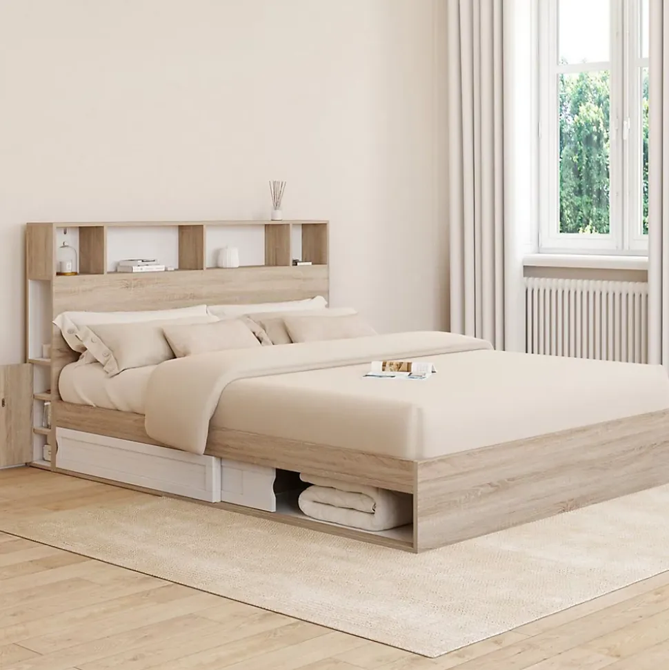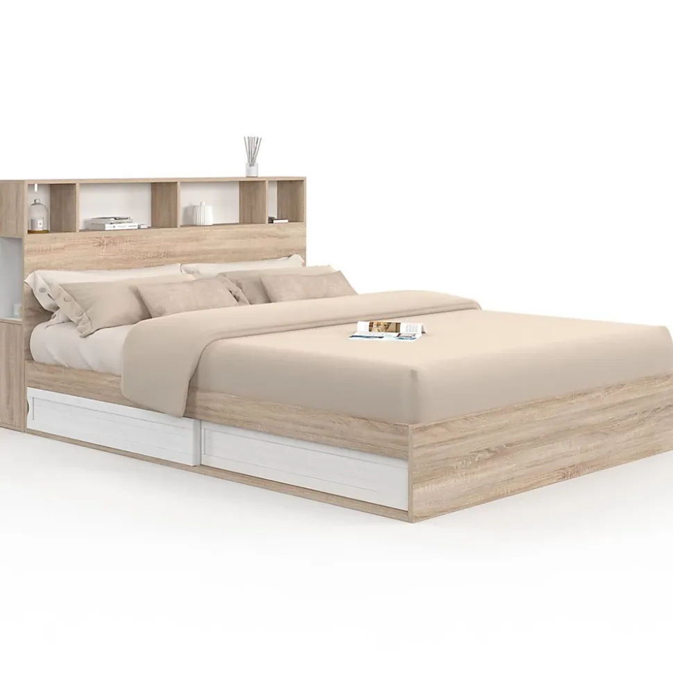 Gagnez de la place de façon astucieuse avec le lit double CLEM effet bois et blanc 160 x 200 cm.Celui-ci est composé d’un cadre de lit avec deux grands compartiments de rangement vous permettant d’y entreposer vos couettes, couvertures et pourquoi pas vos vêtements de la saison suivante. Conçu pour les petits comme les grands espaces, l’ouverture des compartiments se fait à l’aide de portes coulissantes. Le lit CLEM 160 x 200 cm est également composé d’une grande tête de lit tendance et fonctionnelle avec de nombreux rangements. Les niches frontales vous permettront d’y déposer un réveil, une lampe de chevet, une petite plante ou quelques éléments de décoration. Les niches latérales quant à elles, fermées en partie à l’aide d’une porte pression, vous permettent d’y ranger vos livres ou encore nécessaires de nuit de façon discrète et optimale Le lit double CLEM avec rangement s’intégrera parfaitement à votre intérieur grâce à la pureté de ses lignes ainsi qu’à ses couleurs épurées effet bois et blanc. Son design sobre et tendance apportera une touche de fraîcheur et de luminosité à votre chambre à coucher.Sa taille de 160 x 200 cm conviendra parfaitement pour un matelas standard double. De plus, son sommier, composé de 22 lattes, vous offrira un soutien optimal pour votre matelas et un meilleur confort pendant votre sommeil.À la fois pratique et esthétique, ce lit ultra fonctionnel saura trouver sa place dans votre chambre à coucher ou dans une chambre d’amis. N’attendez plus et optez pour le lit double CLEM avec ses rangements et son sommier 160 x 200 cm inclus !Dimensions du lit double CLEM 160 x 200 cm avec rangementsDimensions globales : Longueur 223 cm x largeur 165 cm x Hauteur 105 cmDimensions globales du lit : L. 205 x l. 165 x H. 30 cmNombre de lattes : 22Hauteur du tiroir : 17,50 cm (2 tiroirs)Dimensions intérieures du rangement : 99,50 x 80 x 22,50 cmDimensions globales de la tête de lit : L. 165 x l. 20 x H. 105 cmDimensions grande niche frontale : L. 44,