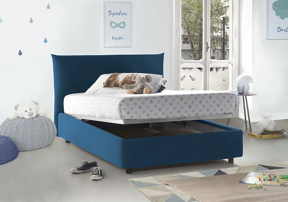 LIT CARRÉ ET DEMI-LIT – Lit coffre avec revêtement en tissu, 100% Made in Italy, Ouverture frontale, avec matelas 120×190 cm inclus, Bleu. STRUCTURE – La structure du lit est en fibre de bois surélevée du sol avec des pieds en ABS et est recouverte de tissu polyester doux, déhoussable et lavable en machine à 30° – La tête de lit linéaire associée aux coutures apparentes en tissu est solide et résistante – Le sommier à lattes en contreplaqué est inclus dans la structure – Mécanisme d’ouverture en fer – L’ajout du coffre de rangement pratique et peu encombrant permet de transformer le lit en un coffre spacieux pour draps, oreillers et couettes. MADE IN ITALY – L’article est produit en Italie, avec l’utilisation des meilleurs matériaux et la plus haute qualité et attention aux détails – Le soin des processus de production est synonyme de fiabilité, de résistance et de raffinement – Made in Certification Italy est une garantie de pleine conformité avec la réglementation de l’Union européenne. MATELAS INCLUS – Matelas orthopédique amovible, anatomique et climatisé avec double support mesurant 120×190, hauteur 21 cm – Structure en polyuréthane expansé solide h 17 cm, densité 30EP recouverte de mousse viscoélastique à mémoire de forme h 2 cm, densité 55EP taille diamant en partie haute – Revêtement en tissu stretch 130 g, déhoussable et lavable en machine à 60° – Rembourrage 100% fibre polytechno, hypoallergénique et anti-acariens – Equipé d’une bande tri-space respirante avec zip et poignée en tissu – Article certifié OekoText. MESURES ET OUVERTURE – Dimensions du lit: Longueur 215 x Largeur 150 x Hauteur 100 cm (hauteur du sommier depuis le sol: 32cm) – Ouverture du conteneur: avant – Profondeur du conteneur: 20 cm environ – Hauteur des pieds: 10 cm environ – Fond de lit en mélamine d’une épaisseur de 1 cm – Avec matelas inclus, dimension: 120×190 cm