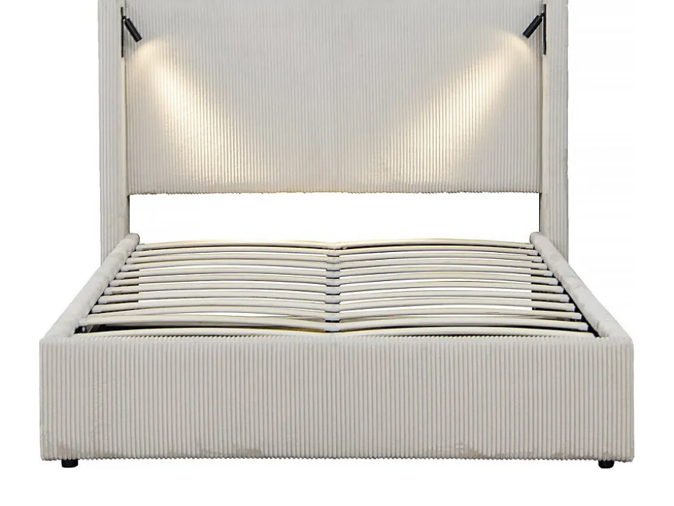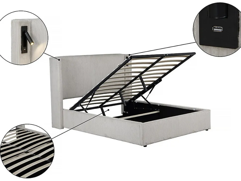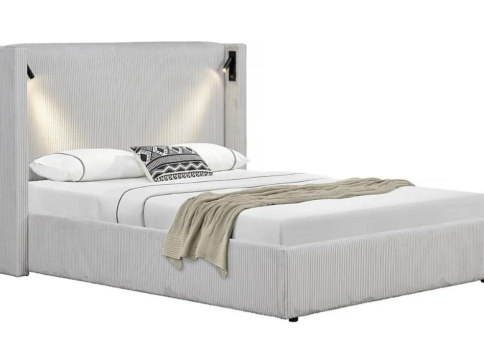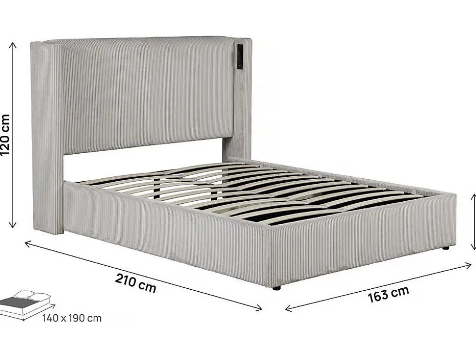 Lit en velours côtelé « Cortina » – BeigeDécouvrez le lit coffre en velours côtelé, l’alliance parfaite entre élégance et praticité. Avec son design raffiné et son revêtement en velours doux, ce lit ajoute une touche de luxe à votre chambre. Pratique et fonctionnel, il est doté d’un coffre spacieux pour optimiser le rangement de vos affaires ! Ses lampes de lecture intégrées de chaque côté offrent un éclairage doux et agréable pour vos moments de détente. Les prises USB intégrées facilitent le chargement de vos appareils directement depuis votre lit. Alliez confort, style et modernité grâce à ce lit coffre exceptionnel, conçu pour répondre à tous vos besoins quotidiens ! Lit coffre en velours côtelé multi fonction – Coffre, Lampes de lectures et prises USB intégrés – Dimensions 210 x 163 x 120 cm – Couleur beige .Descriptif: Lit en velours côtelé Cortina – Dimensions : 210 x 163 x 120 cm – Coffre de rangement – Avec éclairage LED – BeigeMatières: velours côteléMatière(Filtre): Velours côtelésLED: inclusStructure: boisCouleurs: beigeFinition: côtelécouleur (filtre): BeigeDimensions: 210 x 163 x 120 cmLongueur: 210 cmLargeur: 163 cmhauteur: 120 cmDimensions du couchage: 140 x 190 cmSommier: inclusDimensions des lattes: 78 x 54 x 10 cmLattes: 24 lattesÉclairage LED: BlancCoffres: InclusDimensions utiles des coffres: 191 x 141 x 23 cmPoids: 59 KgPoids maximum supporté: 200 kgle + produit: Coffre spacieux pour un rangement optimisé et discret. Revêtement en velours côtelé élégant et raffiné. Lampes de lecture intégrées pour un éclairage pratique. Prises USB des deux côtés pour recharger facilement vos appareils.Colisage: 2 colis : – 1,52 x 0,16 x 0,8 m, 20 kg – 1,96 x 0,37 x 0,35 m, 39 kg