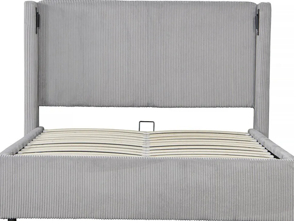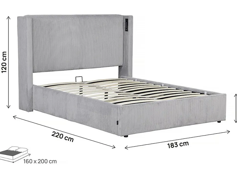Lit en velours côtelé « Cortina » – GrisDécouvrez le lit coffre en velours côtelé, l’alliance parfaite entre élégance et praticité. Avec son design raffiné et son revêtement en velours doux, ce lit ajoute une touche de luxe à votre chambre. Pratique et fonctionnel, il est doté d’un coffre spacieux pour optimiser le rangement de vos affaires. Ses lampes de lecture intégrées de chaque côté offrent un éclairage doux et agréable pour vos moments de détente. Les prises USB intégrées facilitent le chargement de vos appareils directement depuis votre lit. Alliez confort, style et modernité grâce à ce lit coffre exceptionnel, conçu pour répondre à tous vos besoins quotidiens ! Lit coffre en velours côtelé multi fonction – Coffre, Lampes de lectures et prises USB intégrés – Dimensions 220 x 183 x 120 cm – Couleur beige .Descriptif: Lit en velours côtelé Cortina – Dimensions : 220 x 183 x 120 cm – Coffre de rangement – Avec éclairage LED – GrisMatières: velours côteléMatière(Filtre): Velours côtelésLED: inclusStructure: boisCouleurs: GrisFinition: côtelécouleur (filtre): Gris.Dimensions: 220 x 183 x 120 cmLongueur: 220 cmLargeur: 183 cmhauteur: 120 cmDimensions du couchage: 160 x 200 cmSommier: inclusLattes: 26 lattesÉclairage LED: BlancCoffres: InclusDimensions utiles des coffres: 201 x 161 x 23 cmPoids: 63.6 kgPoids maximum supporté: 200 kgle + produit: Coffre spacieux pour un rangement optimisé et discret. Revêtement en velours côtelé élégant et raffiné. Lampes de lecture intégrées pour un éclairage pratique. Prises USB des deux côtés pour recharger facilement vos appareils.Colisage: 2 colis : – 1,72 x 0,16 x 0,8 m, 22,6 kg – 2,06 x 0,37 x 0,35 m, 41 kg