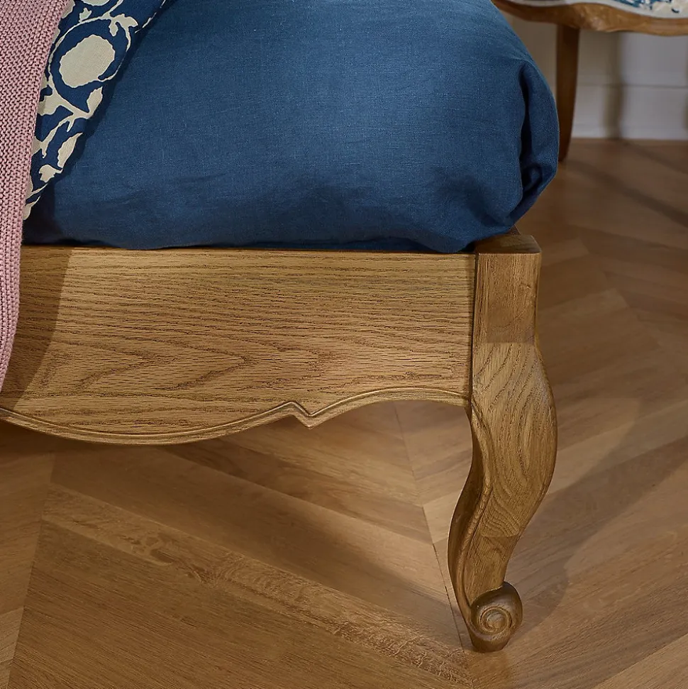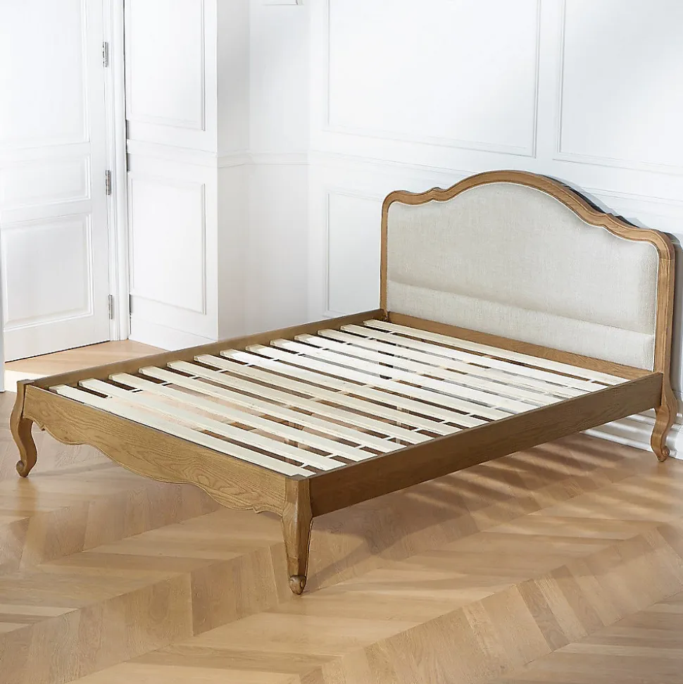 Description du produit Invitez le charme du style Shabby chic dans votre intérieur avec le lit HENRY. Son design aux lignes galbées et harmonieuses crée une atmosphère douce et relaxante, idéale pour transformer votre chambre en véritable cocon. La solidité de sa structure et de ses pieds en chêne massif promet une excellente tenue dans le temps. Sa tête de lit, délicatement habillée de lin premium, apporte élégance et confort au quotidien. Prévu pour accueillir un matelas de 140 x 190 cm il est équipé de 13 lattes en multiplis et d’une barre centrale pour une parfaite stabilité. De plus, son espace sous le cadre peut accueillir vos housses de couette, boîtes de rangement, chaussures ou encore valises fines pour optimiser l’organisation de votre chambre. Adopter le lit HENRY, c’est choisir un espace pensé pour le bien-être : idéal pour s’installer confortablement avec un livre, profiter d’un petit-déjeuner au lit ou simplement se détendre dans une ambiance paisible. Existe également en version 160 x 200 cm. Pourquoi vous allez l’aimer ? Ce lit reprend les codes du mobilier classique avec ses pieds galbés en volute qui rappellent l’esprit Louis XV et apportent une silhouette légère. Sa tête de lit chantournée, encadrée de bois mouluré et tapissée d’un tissu lin premium, adoucit l’ensemble et invite au confort. Caractéristiques utiles Livré à assembler hauteur des pieds : 39 cm Hauteur entre les lattes et la tête de lit : 21,5 cm Inspiration déco Associez notre lit HENRY à notre commode OLIVIA pour une chambre élégante et harmonieuse. L’engagement Robin des bois Sélection rigoureuse des matériaux, issus de sources responsables. Finitions durables, pensées pour vous accompagner au quotidien. Robin des Bois, c’est aussi une maison attentive au service et à la relation client. Contactez notre service client au 09 86 33 85 85 pour plus de renseignements.