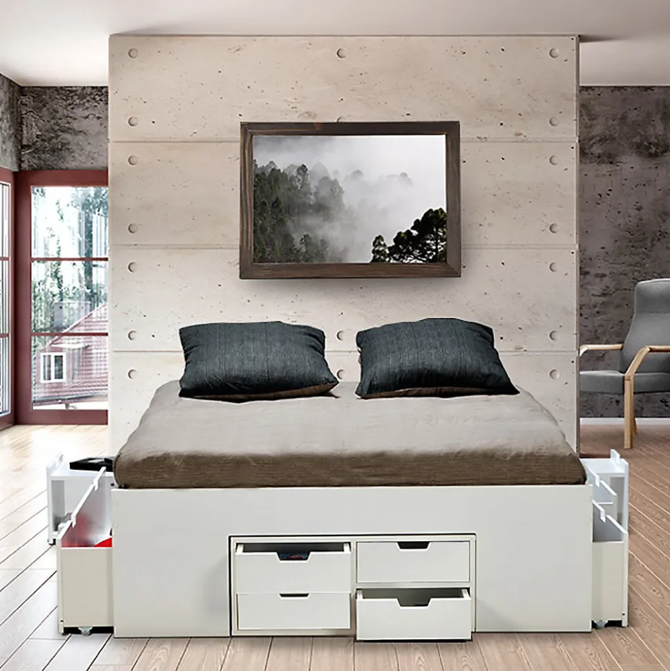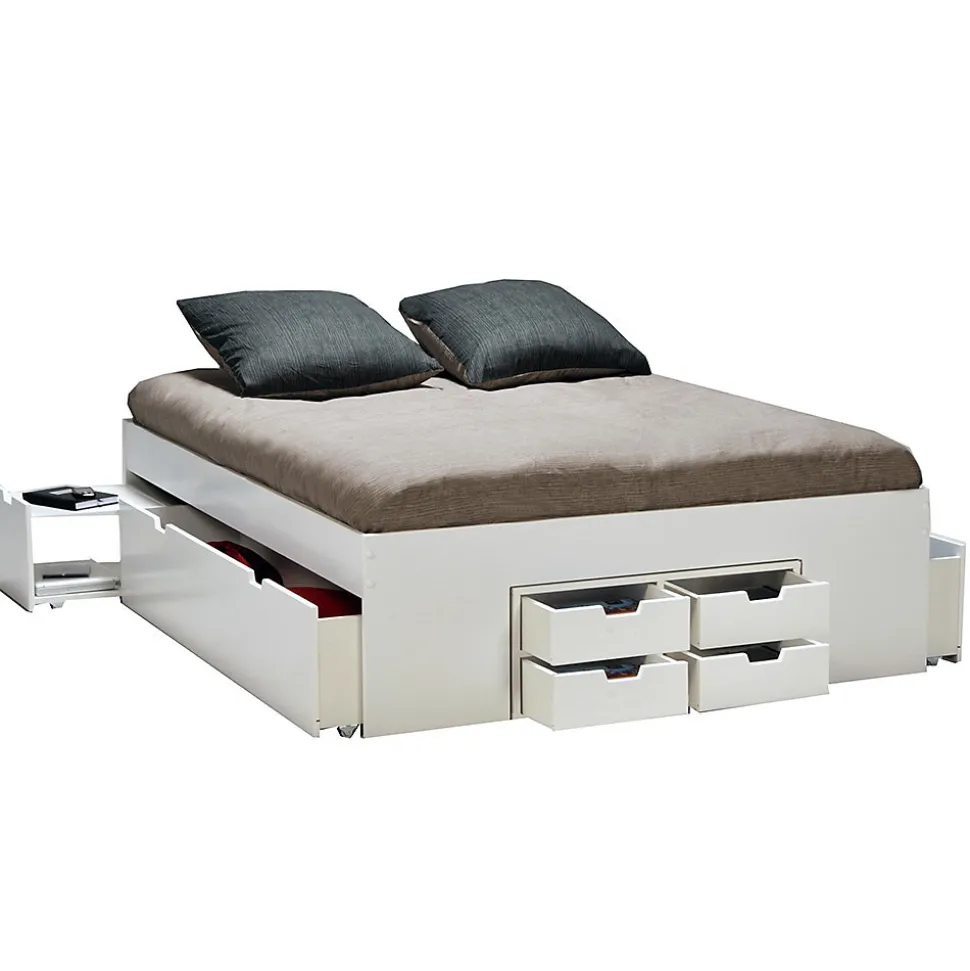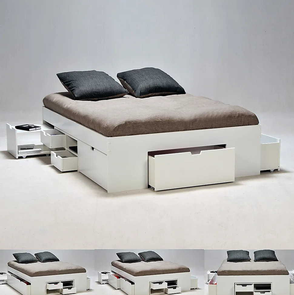 - Lit double JAZZ 160 x 200 cm 7 tiroirs + 2 chevetsStructure en panneau de particulesColoris: blancL’ensemble des tiroirs et caisson sont indépendants du lit et peuvent être disposés librement.Livré démonté, sans matelas, sans sommier, prévoir un sommier à cadre. A monter soi-mêmeDimensions:202x164x45