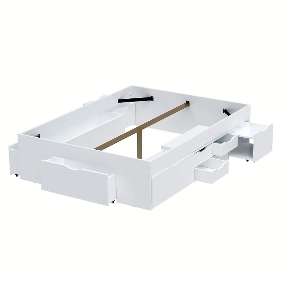 Lit double JAZZ 160 x 200 cm 7 tiroirs + 2 chevetsStructure en panneau de particulesColoris: blancL’ensemble des tiroirs et caisson sont indépendants du lit et peuvent être disposés librement.Livré démonté, sans matelas, sans sommier, prévoir un sommier à cadre. A monter soi-mêmeDimensions:202x164x45