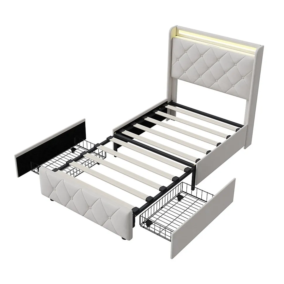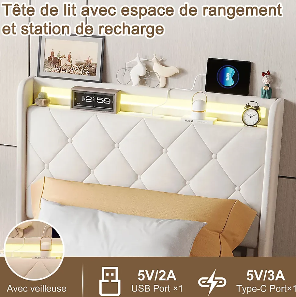 1. Tête de lit avec station de charge intégrée : Équipée d’un port USB et d’un port USB-C, idéale pour recharger téléphone, tablette ou autres appareils directement depuis le lit.2. Éclairage LED multicolore : Bande LED intégrée offrant plusieurs couleurs pour créer une ambiance personnalisée et chaleureuse dans la chambre.3. Grand espace de rangement avec tiroirs : 2 tiroirs spacieux montés sur roulettes, faciles à manipuler et parfaits pour optimiser le rangement du linge de lit ou des vêtements.4. Revêtement en flanelle de haute qualité : Tissu doux, protecteur et agréable au toucher, assurant un excellent confort et une bonne respirabilité.5. Design moderne et fonctionnel : Structure stable, lignes épurées et finition soignée, adaptée à une chambre contemporaine tout en maximisant l’espace.Détails du produit :Dimensions totales : 212 x 95 x 114 cm (L x l x h).Surface de couchage : 90 x 200 cm.Couleur : Beige.Poids net/brut : 36 kg.Matériau du panneau : MDF + métal.Poids maximal de l’utilisateur : 200 kg.Nombre de colis : 1.Assemblage requis : oui.&Remarques&※ En raison de la mesure manuelle, un écart de 2 à 3 cm peut se produire.※ En raison de l’influence de la lumière du soleil et d’autres facteurs, il peut y avoir de légères différences de couleur.※ Si vous avez des questions pendant l’installation, veuillez nous contacter dès que possible