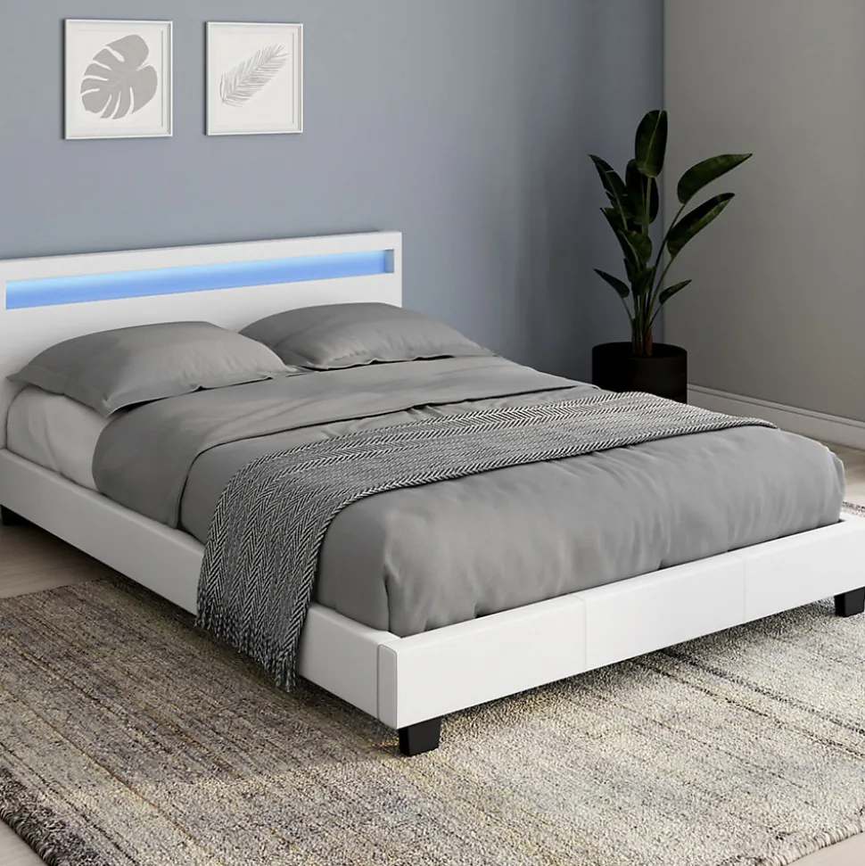 Le lit double pour adulte NEO 140x190cm avec sommier apportera une touche d’originalité à votre chambre à coucher et l’illuminera d’une ambiance cosy et chaleureuse grâce à son bandeau LED présent au niveau de la tête de lit.Son design chic et contemporain ainsi que son revêtement en PVC blanc souligneront son style élégant. Sa tête de lit confortable et rembourrée contient un bandeau d’éclairage LED dont vous pourrez changer facilement la couleur au gré de vos envies à l’aide d’une télécommande. Stable et robuste, il dispose de 4 pieds en plastique noir aux extrémités renforcés par 2 pieds de soutien en métal supplémentaires sous le sommier. Livré avec un sommier 24 lattes de bois, le lit double pour adulte NEO avec sommier 140x190cm sera d’un confort incomparable pour vous faire passer de douces nuits.Ce lit double pour adulte NEO 140x190cm avec LED intégrée apportera un design unique à votre chambre à coucher et saura adapter sa lumière selon vos envies.Dimensions du lit double NEO 140x190cm PVC blancDimensions globales hors tout : Longueur 203 cm x largeur 149 cm x Hauteur 78 cmDimensions tête de lit : L.149 x ép. 7 x H. 70 cmDimensions standard pour un matelas 140×190 cm 2 placesNettoyage facile avec un chiffon humide Matelas non fourniÀ monter soi-même Nombre de colis : 2Carton 1 : 151,5 x 89 x 8,5 cm – poids 14,5 kgCarton 2 : 198,5 x 19,5 x 16,5 cm – poids 19 kg* Produit non livrable en Corse Retrouvez l’ensemble de notre gamme de lits sur notre boutique en ligne !