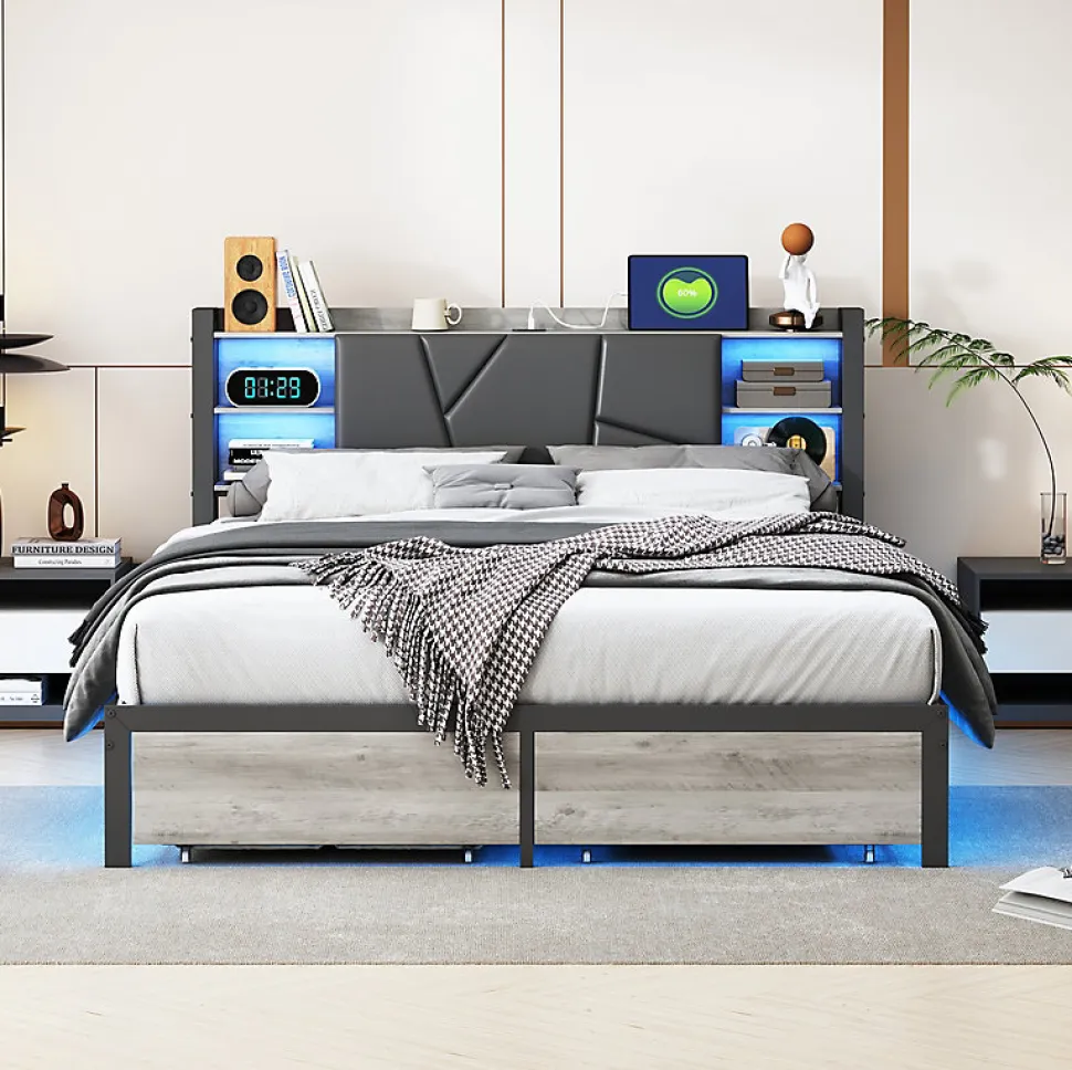 cadre de lit double 160 x 200 cm : ce lit double spacieux offre un espace généreux pour deux adultes et est idéal pour les chambres spacieuses ou cloisonnées. Son design moderne et minimaliste, avec sa finition noire élégante, s’intègre parfaitement à n’importe quelle pièce, créant une atmosphère élégante et accueillante. éclairage led et recharge usb intégrée : une bande lumineuse led intégrée crée une ambiance chaleureuse et moderne dans votre chambre. La fonction de recharge usb sur le cadre de lit permet de recharger facilement vos appareils sans avoir à chercher une prise, une fonctionnalité bien pensée qui simplifie et agrémente votre quotidien. tête de lit avec rangement pratique : la tête de lit offre des rangements astucieux pour accéder facilement aux livres, réveils et autres objets importants. Elle est idéale pour les petits espaces où l’espace et l’organisation sont primordiaux. cadre en fer robuste avec tiroirs : le cadre en fer robuste garantit la solidité et la durabilité du cadre de lit. Deux tiroirs spacieux au pied du lit offrent un espace de rangement supplémentaire pour les vêtements, les couettes ou autres ustensiles, idéal pour garder votre chambre bien rangée. pas besoin de matelas : ce lit plateforme est livré sans matelas, vous permettant de choisir celui qui correspond le mieux à vos besoins de confort. Son design noir classique s’harmonise avec tous les styles de décoration, qu’ils soient modernes ou classiques.description du produitlit capitonné 160 x 200 cm : dimensions : 160,5 x 214 x 100 cm (l x l x h).matériaux : métal + bois + cuir synthétiquecouleur : noir.capacité de charge maximale : 350 kg.caractéristiques uniques : fonction de charge + éclairage led.assemblage requis : oui.compatible avec les matelas : 160 x 200 cm (matelas non inclus)lot de 2