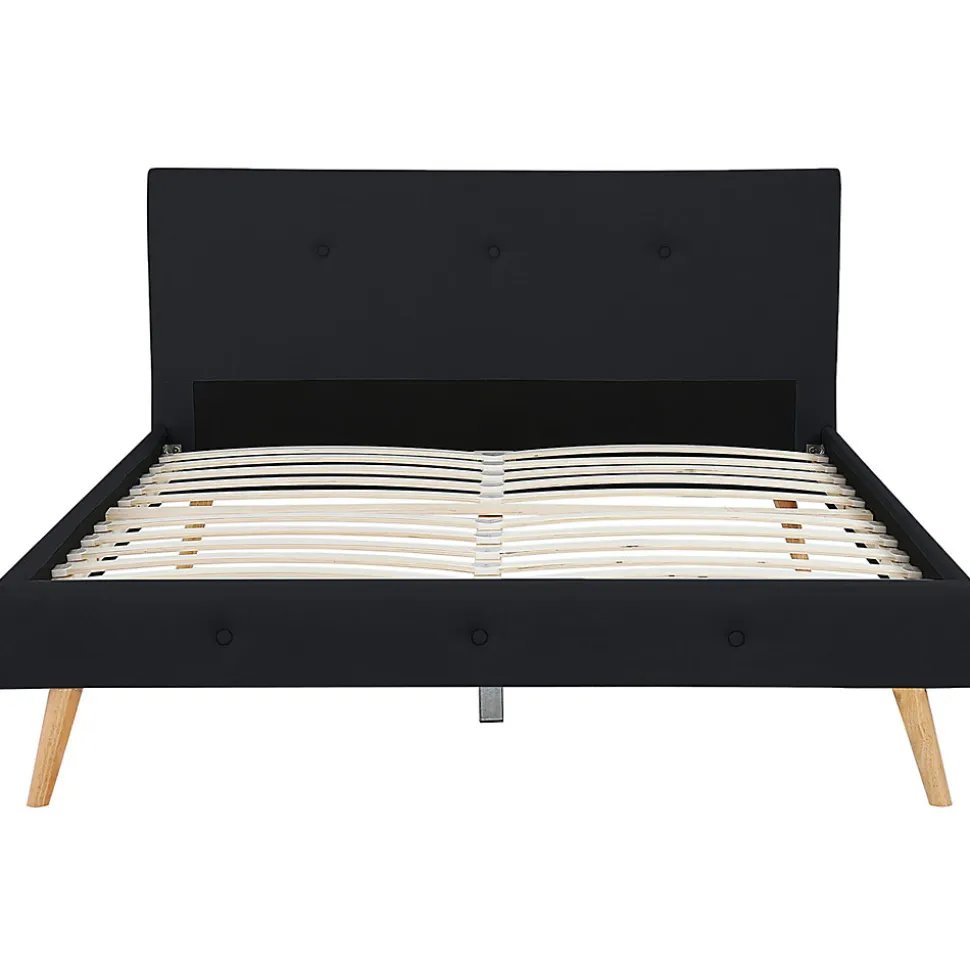 Décorez et aménager votre chambre avec un touche venue tout droit de Scandinavie ! Offrez-vous ce lit double 160×200 cm ultra-confortable et créez une véritable ambiance cocooning dans votre chambre à coucher ou chambre d’amis. Son design scandinave aux finitions sophistiquées habillera votre pièce avec élégance. Doté d’une jolie tête de lit en tissu 100% polyester façon lin suédine coloris noir, le capitonnage 3 boutons rappelle celui du cadre de lit.Son contour de lit tout en tissu noir et ses 4 pieds bois (hauteur 18 cm) inclinés lui confèrent un style sobre et moderne. La densité de la mousse (240gr/m3) lui confère un aspect harmonieux. Stable et robuste, sa structure en bois MDF est renforcée par 3 pieds centraux de renfort en métal. Livré avec son sommier à 24 lattes en bois tout confort, la zone lombaire est renforcée grâce au resserrement des lattes pour garantir un confort optimal. Sa forme ergonomique facilite l’aération du matelas et apporte flexibilité au couchage. Dimensions lit scandinave noir 160 x 200 CMDimensions standard pour un matelas 160 x 200 cm 2 places.Dimensions Tête de lit : Longueur 167 x Hauteur 70 (sans les pieds) x Epaisseur 6,5 cmDimensions globales hors tout : Longueur 214 x largeur 167 x Hauteur 88 cm environ24 lattes : 22 lattes + 1 latte centrale doubleNettoyage facile avec chiffon humideMatelas non fourni*Produit non livrable en Corse